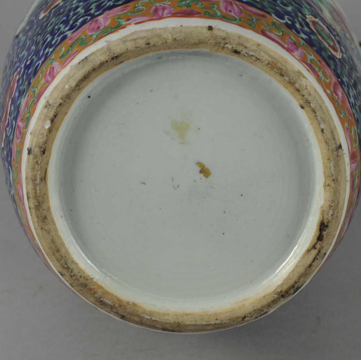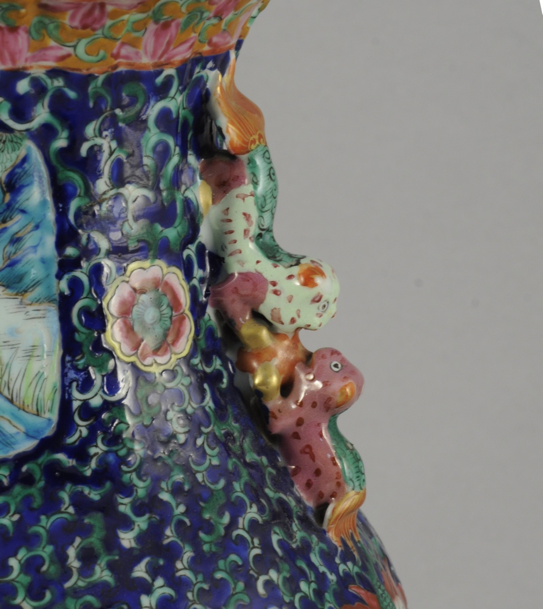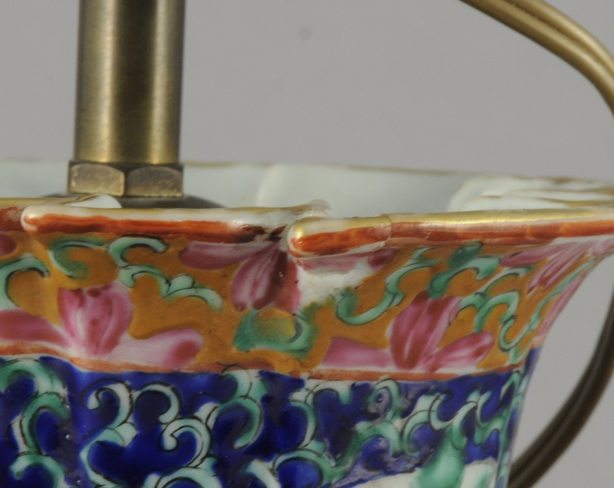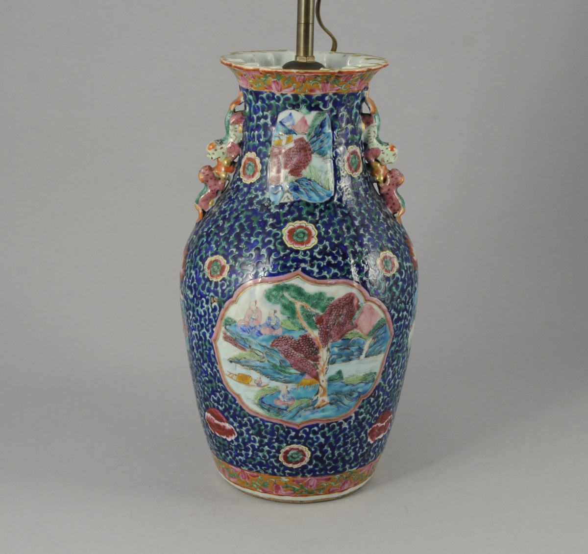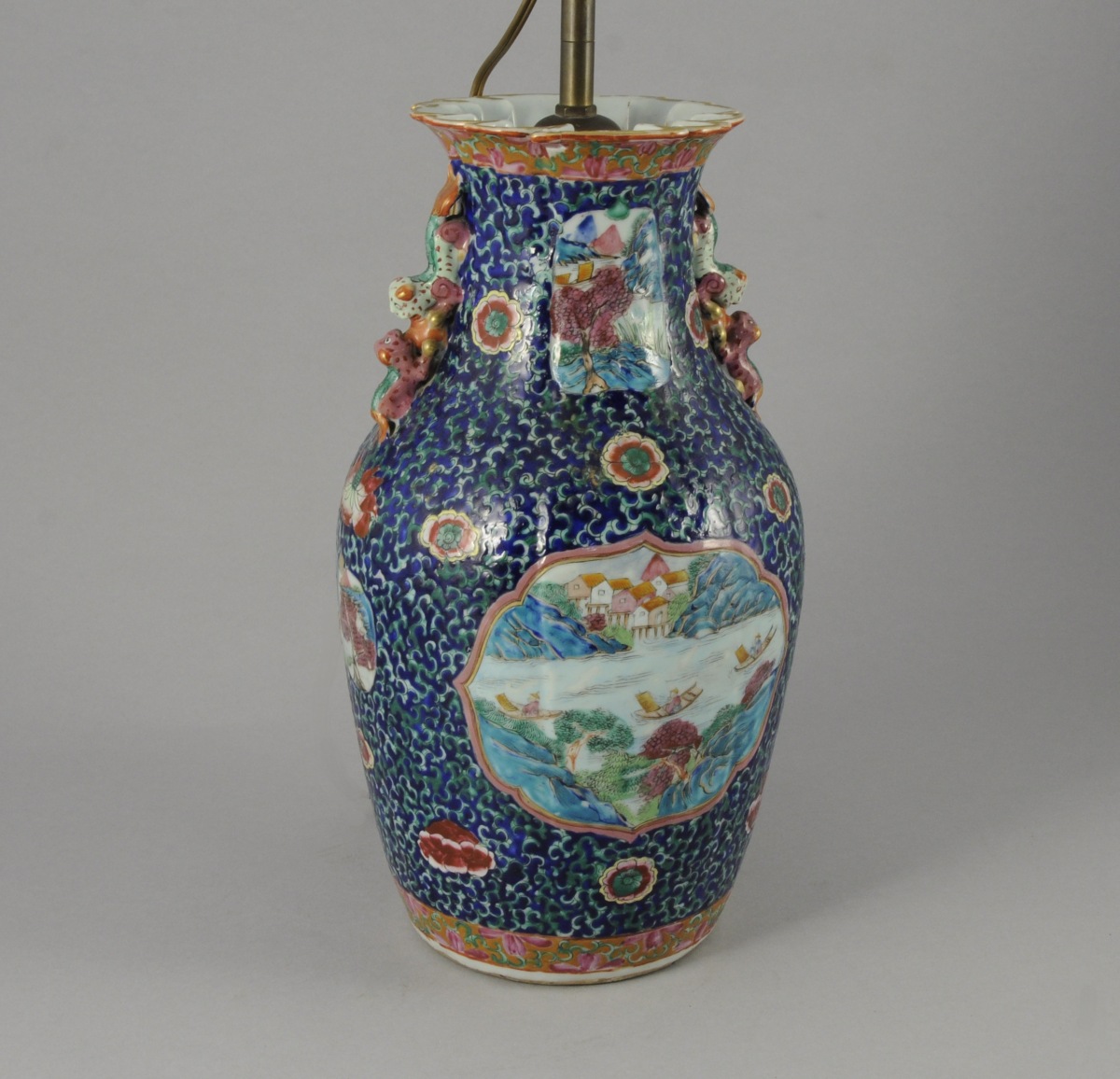 VASE en porcelaine monté en lampe. Décor polychrome de scènes lacustres. Les anses adoptent la forme de deux chiens se disputant une boule. Chine, XXème. Haut. 33, Diam. 18 cm. (petits éclats et petite restauration au col)