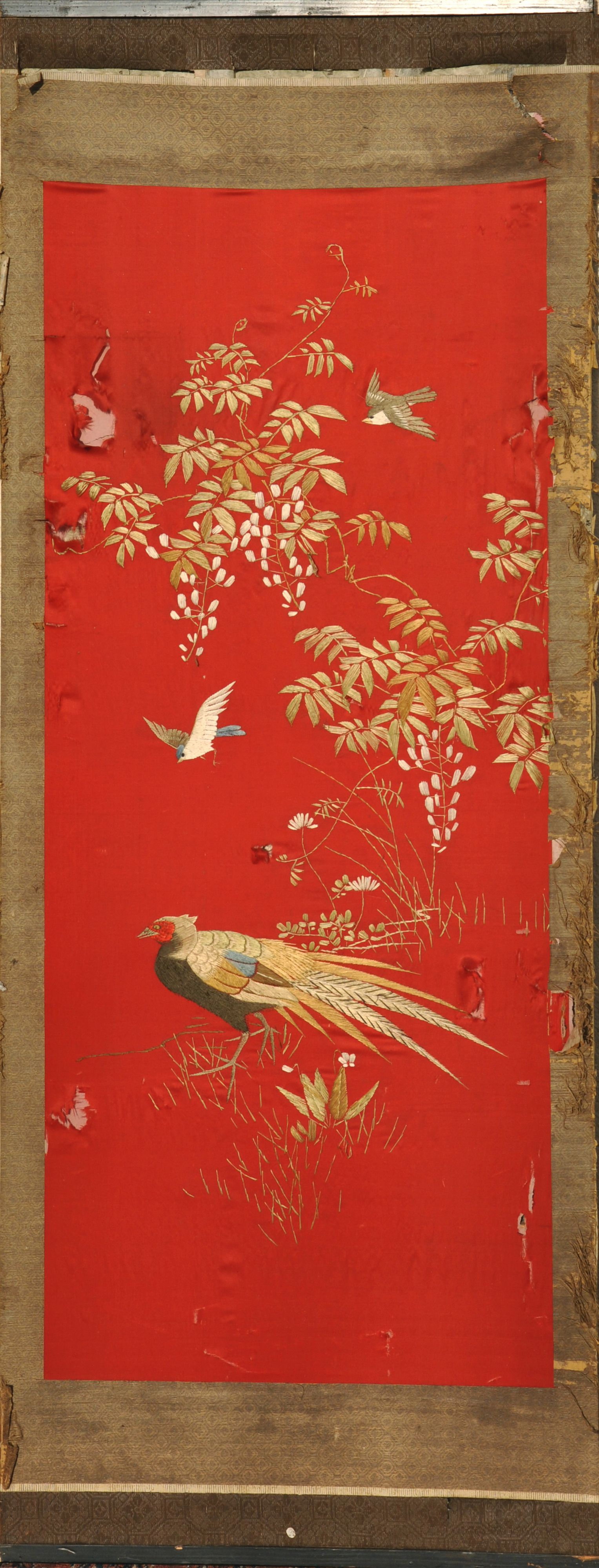 FEUILLE de PARAVENT recouverte d'une soierie représentant un faisan et deux petits oiseaux volants dans des feuillages sur un fond rouge. Travail probablement chinois du début du XXème. (accidents et manques)