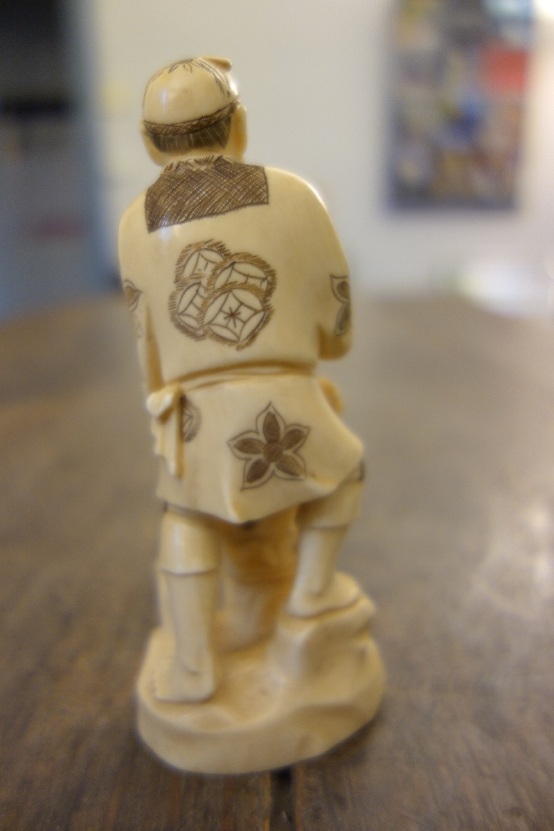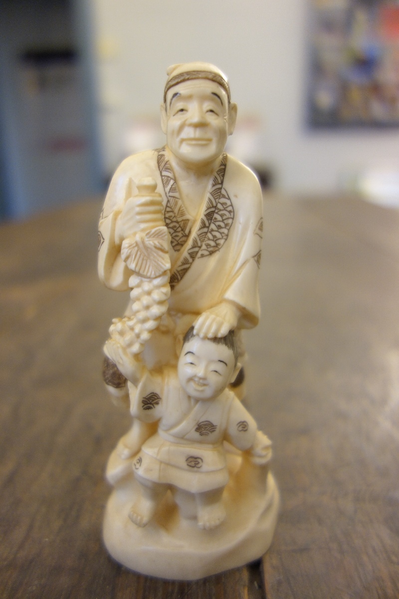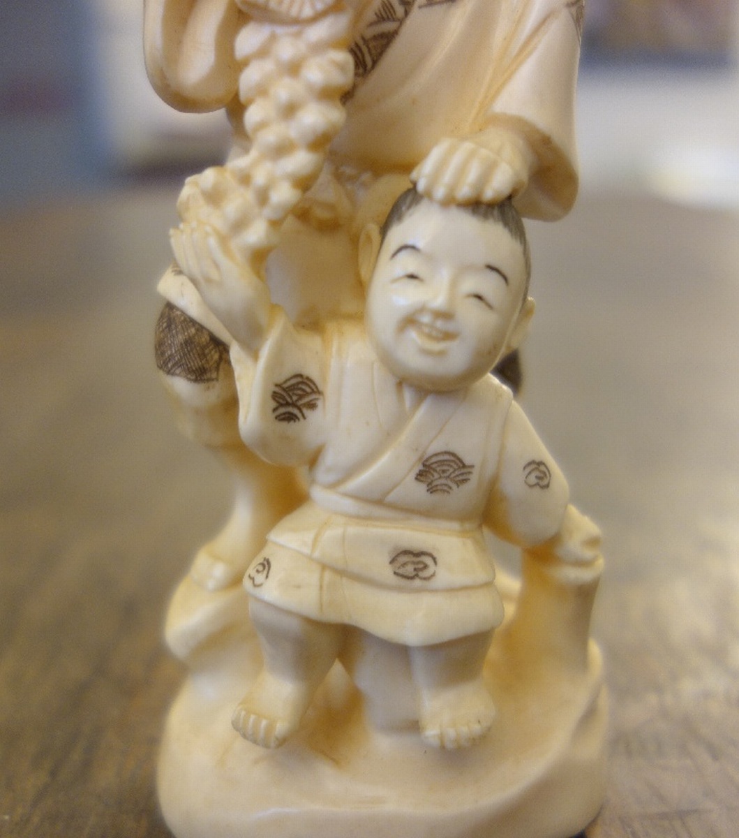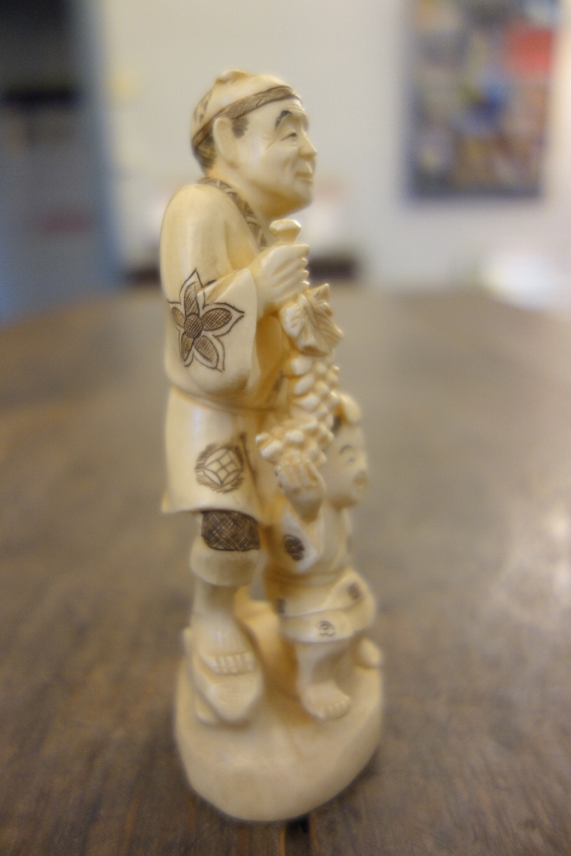 OKIMONO en ivoire figurant un vigneron et un enfant à décor gravé. Cachet. Travail chinois dans le goût du Japon, XXème. Haut. 13 cm.