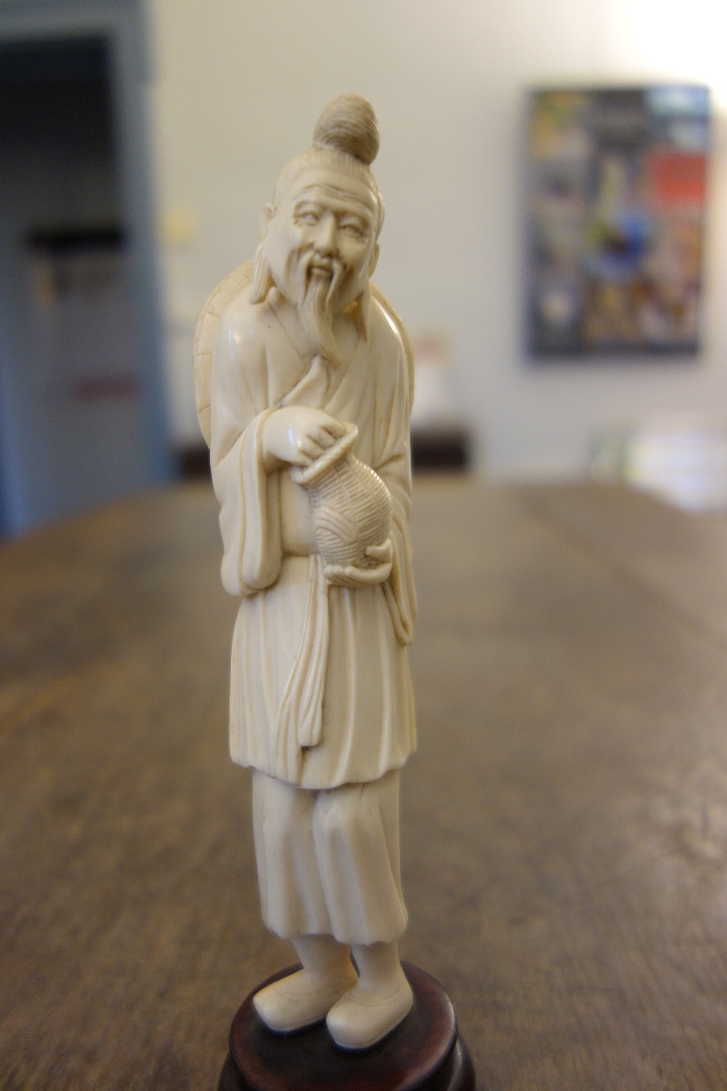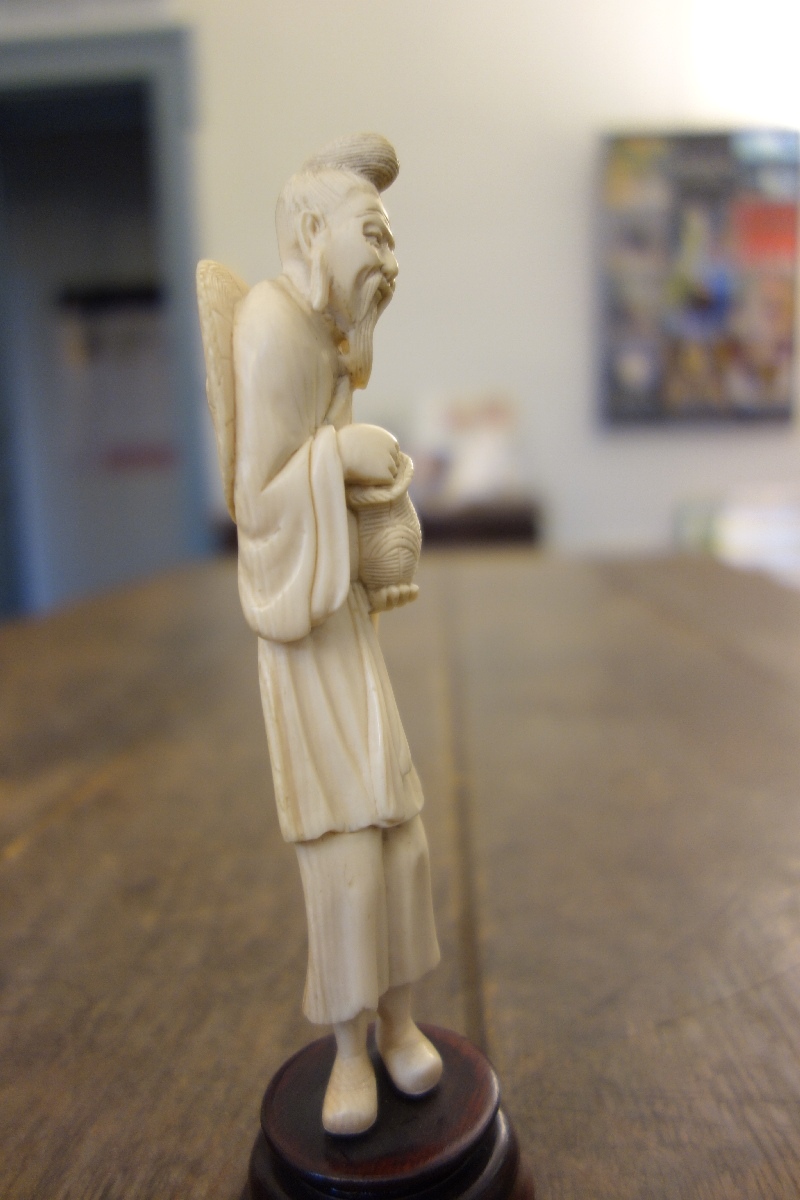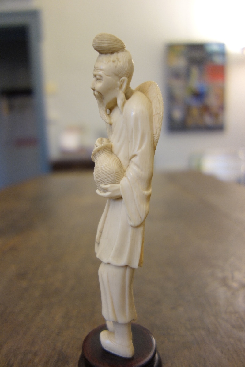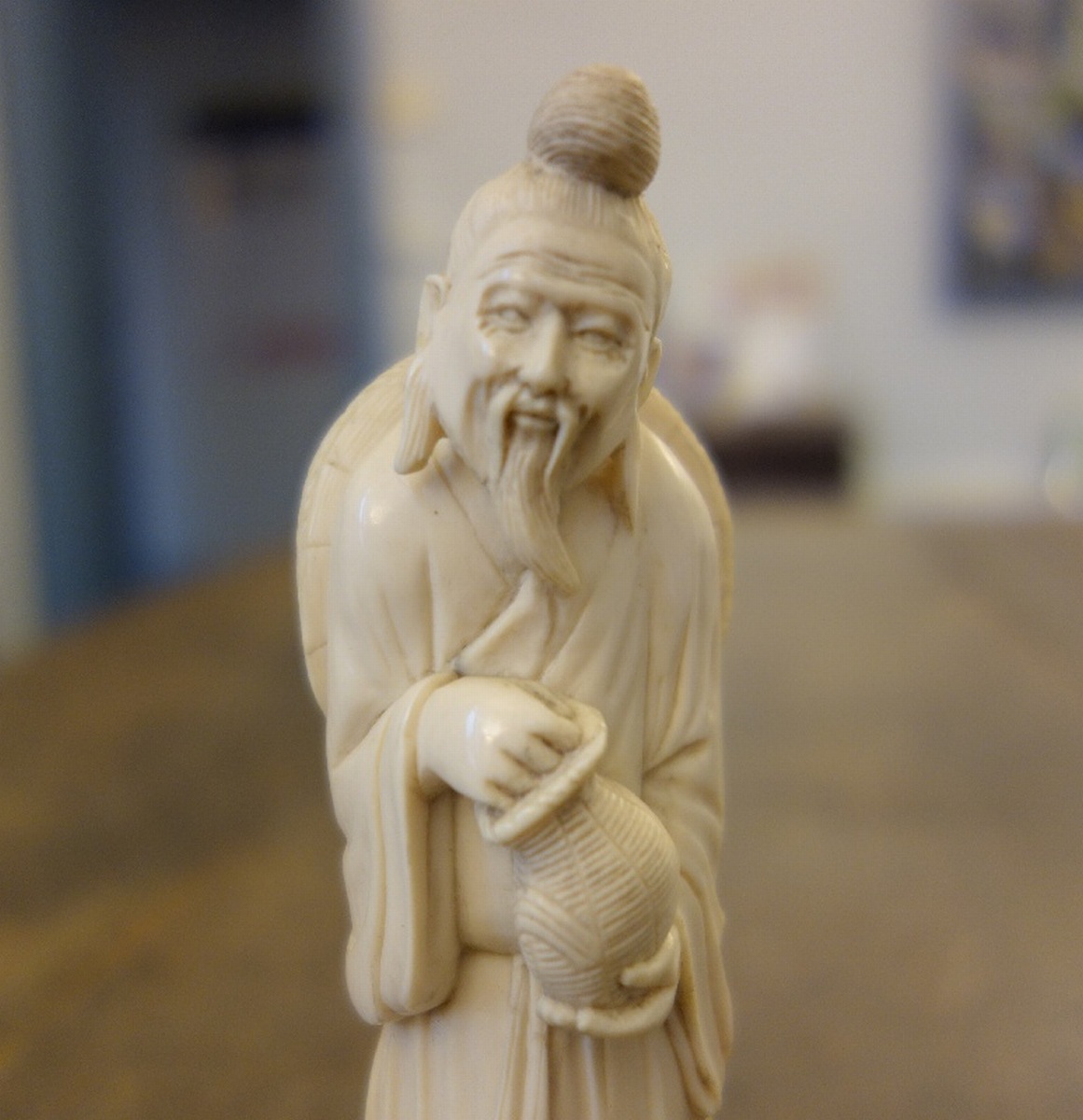STATUETTE en ivoire figurant un vieillard au panier. Chine, XXème. Haut. 15,5 cm. Sur un socle en bois rougi.