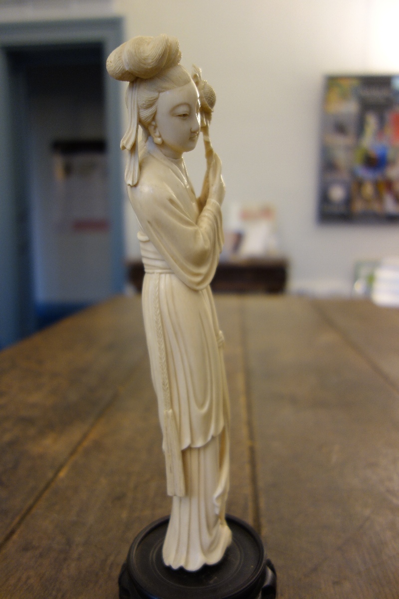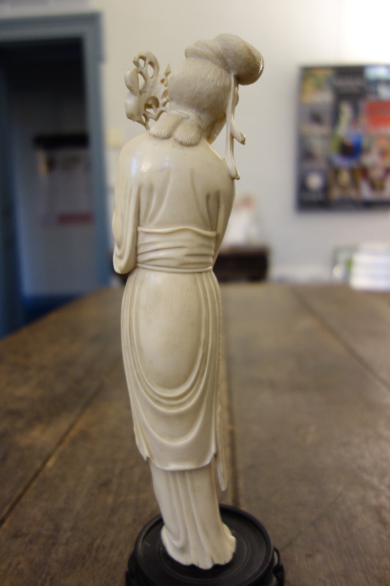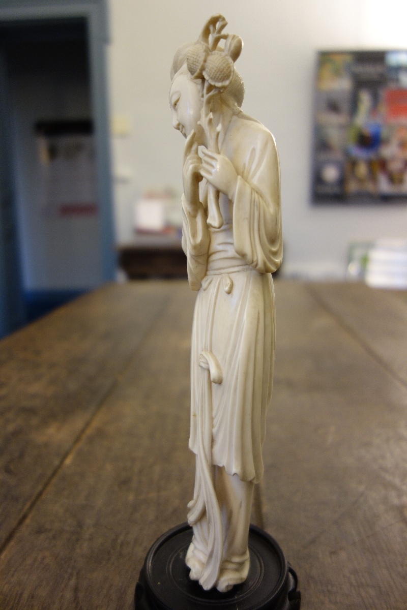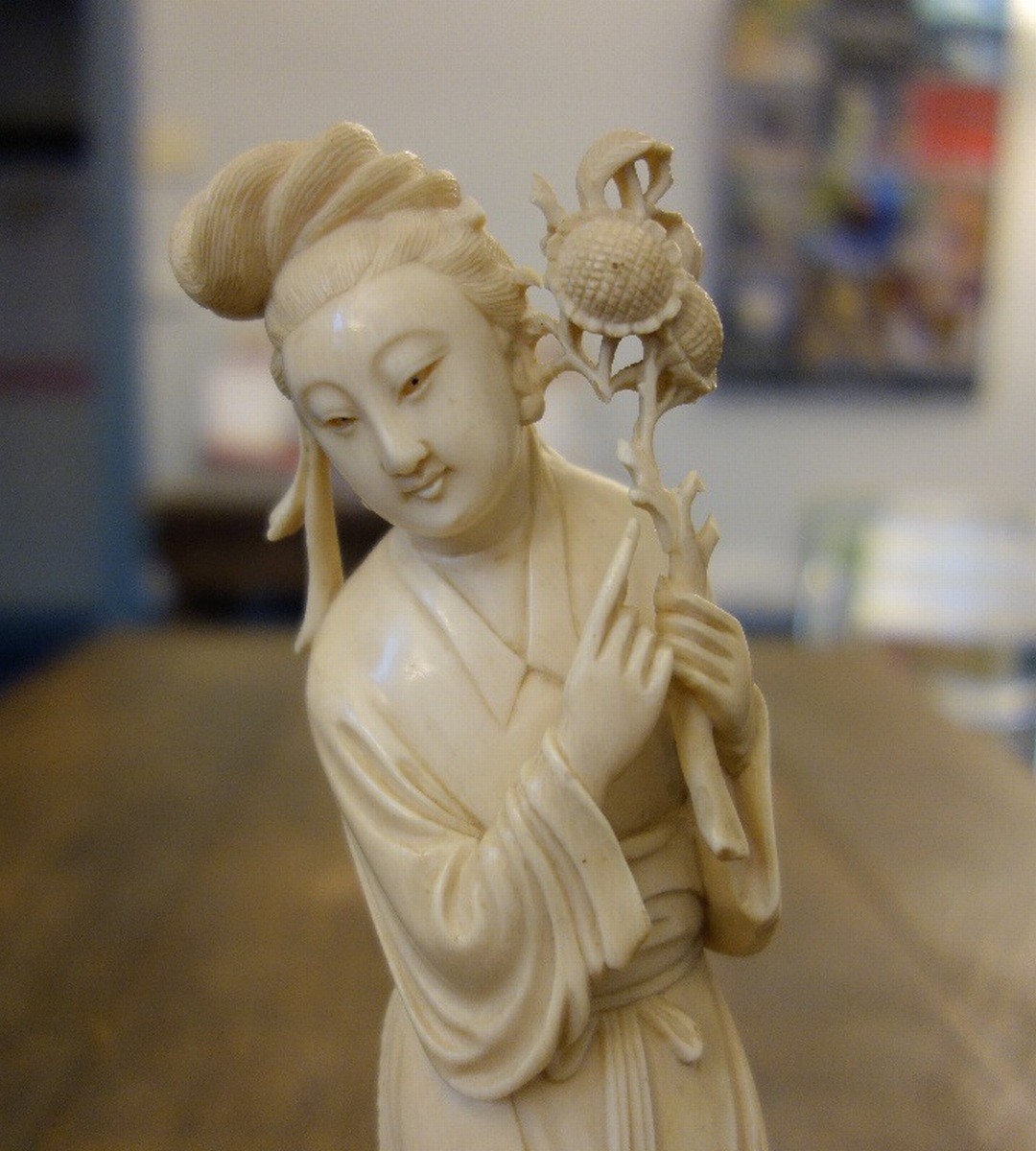 STATUETTE en ivoire figurant une femme montrant une fleur d'éternité. Chine, XXème. Haut. 25,3 cm. Sur un socle en bois noirci.(petits manques et restauration)