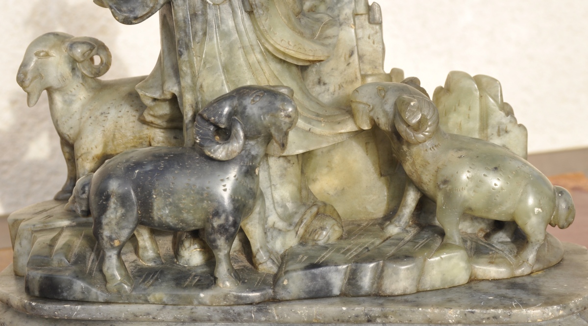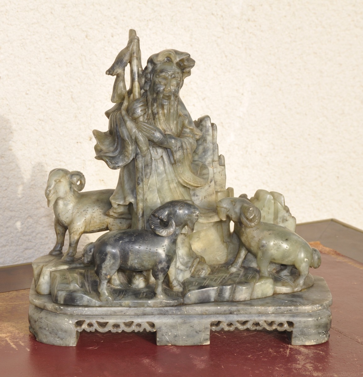 GROUPE en pierre dure verte sculptée représentant un berger et son troupeau. Travail moderne, Asie. Haut. 27, Larg. 27, Prof. 9 cm.
