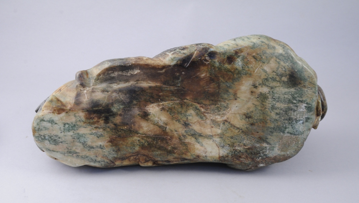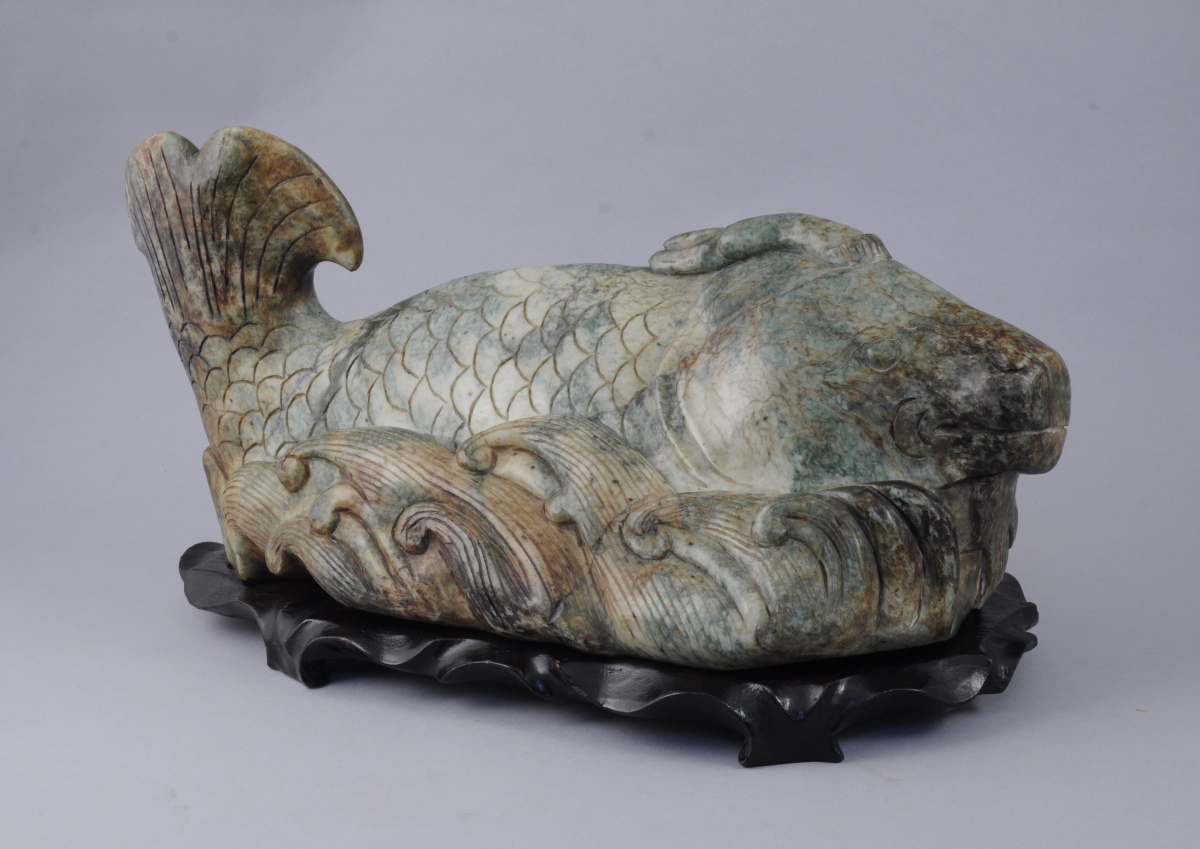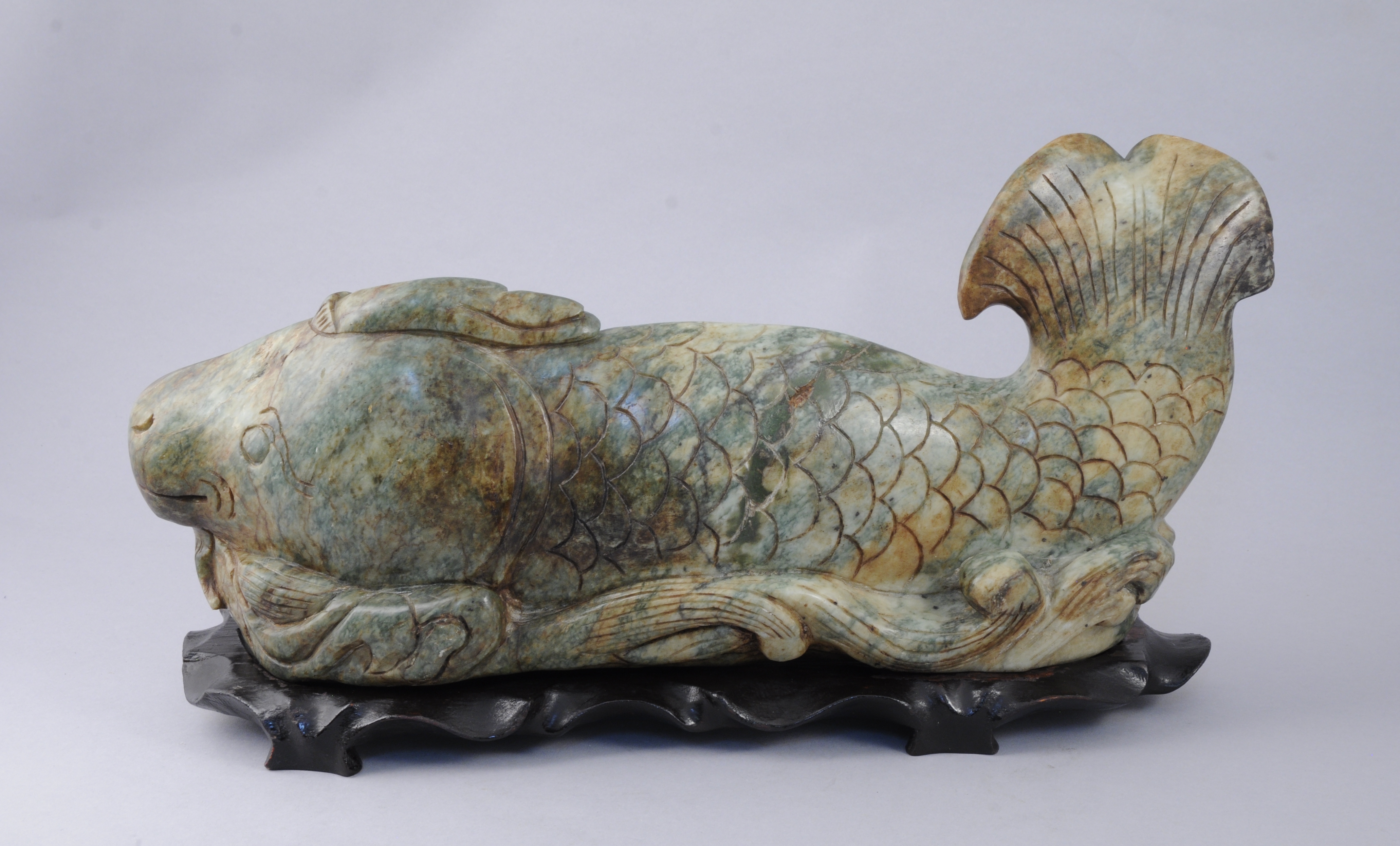 CARPE en pierre dure sculptée (jade ?). Travail asiatique du XXème. Haut. 21, Long. 40,5, Prof. 8 cm.