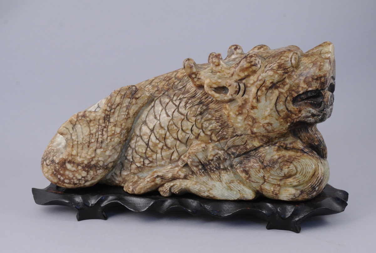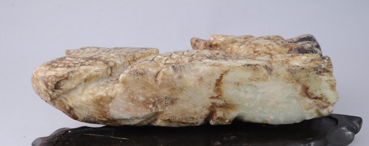 CARPE en pierre dure sculptée (jade ?). Travail asiatique du XXème. Haut. 19, Long. 56,5, Prof. 19 cm.