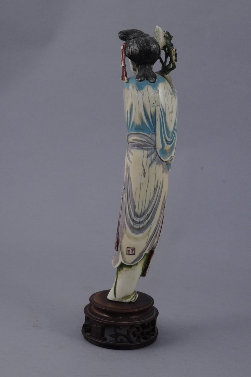 STATUETTE en ivoire sculpté polychrome représentant une femme tenant un branchage fleuri. Porte une signature. Chine, XXème. Haut. 31,5 cm. Sur son socle de bois noirci.