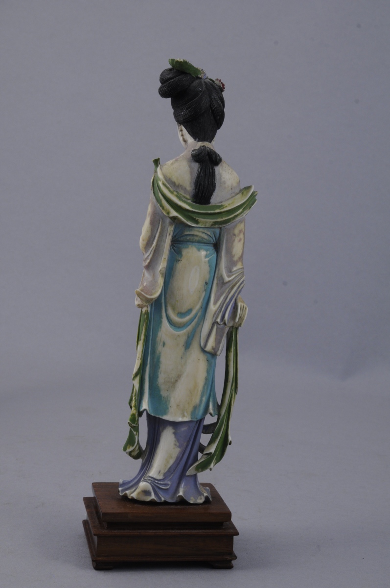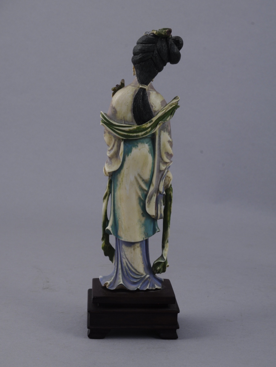 Deux STATUETTES en ivoire sculpté polychrome représentant une femme tenant une rose. Chine, XXème. Haut. 20,5 et 18 cm. Sur leurs socles de bois noirci.