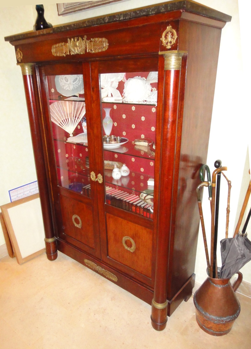 VITRINE en acajou et placage d'acajou mouluré. Garnitures de bronze doré et ciselé. Style Empire.