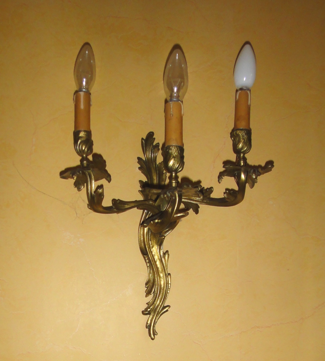 PAIRES D'APPLIQUES en bronze ciselé et doré à 3 bras de lumière. Style Louis XV.