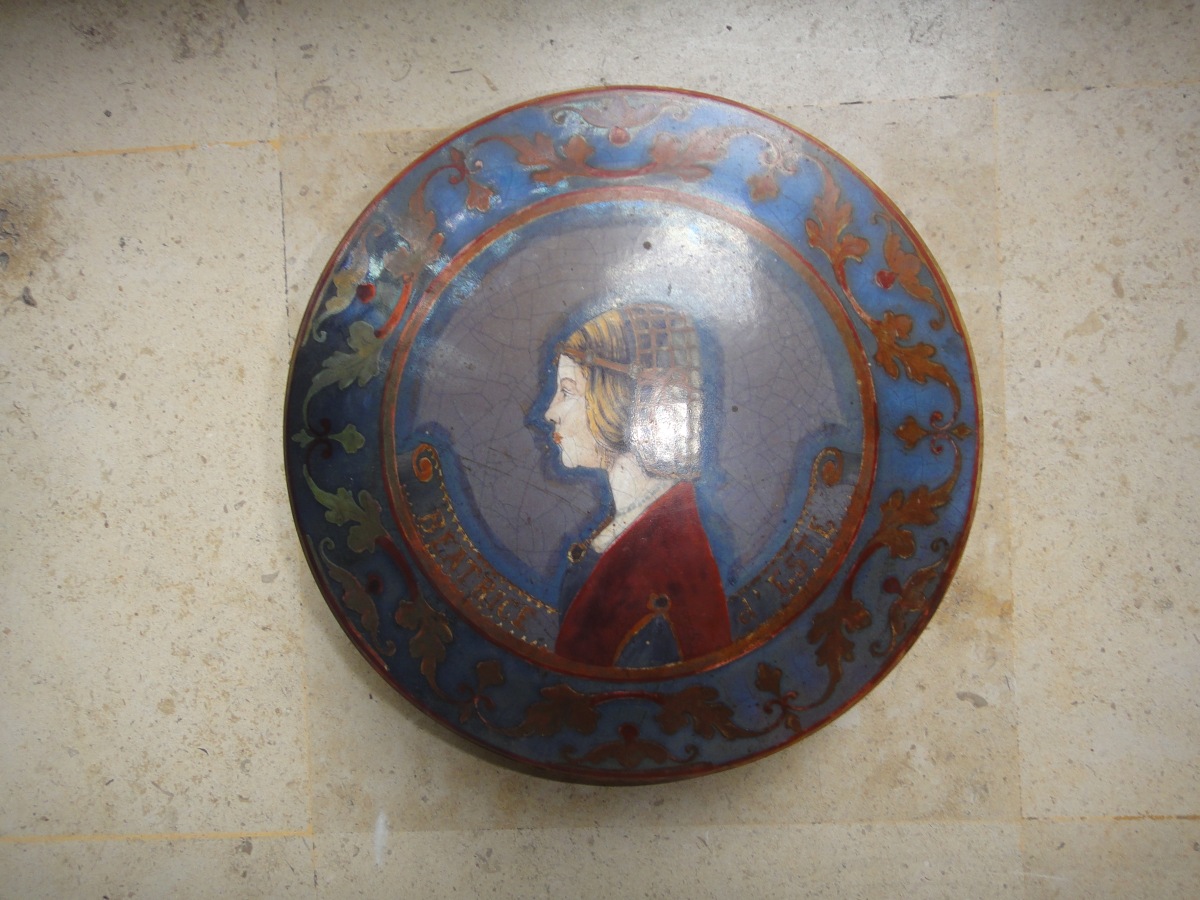 COUPE en faïence polychrome de Blois, figurant dans le bassin Béatrice d'Este. Aile à décor de rinceaux feuillagés. Style Renaissance.