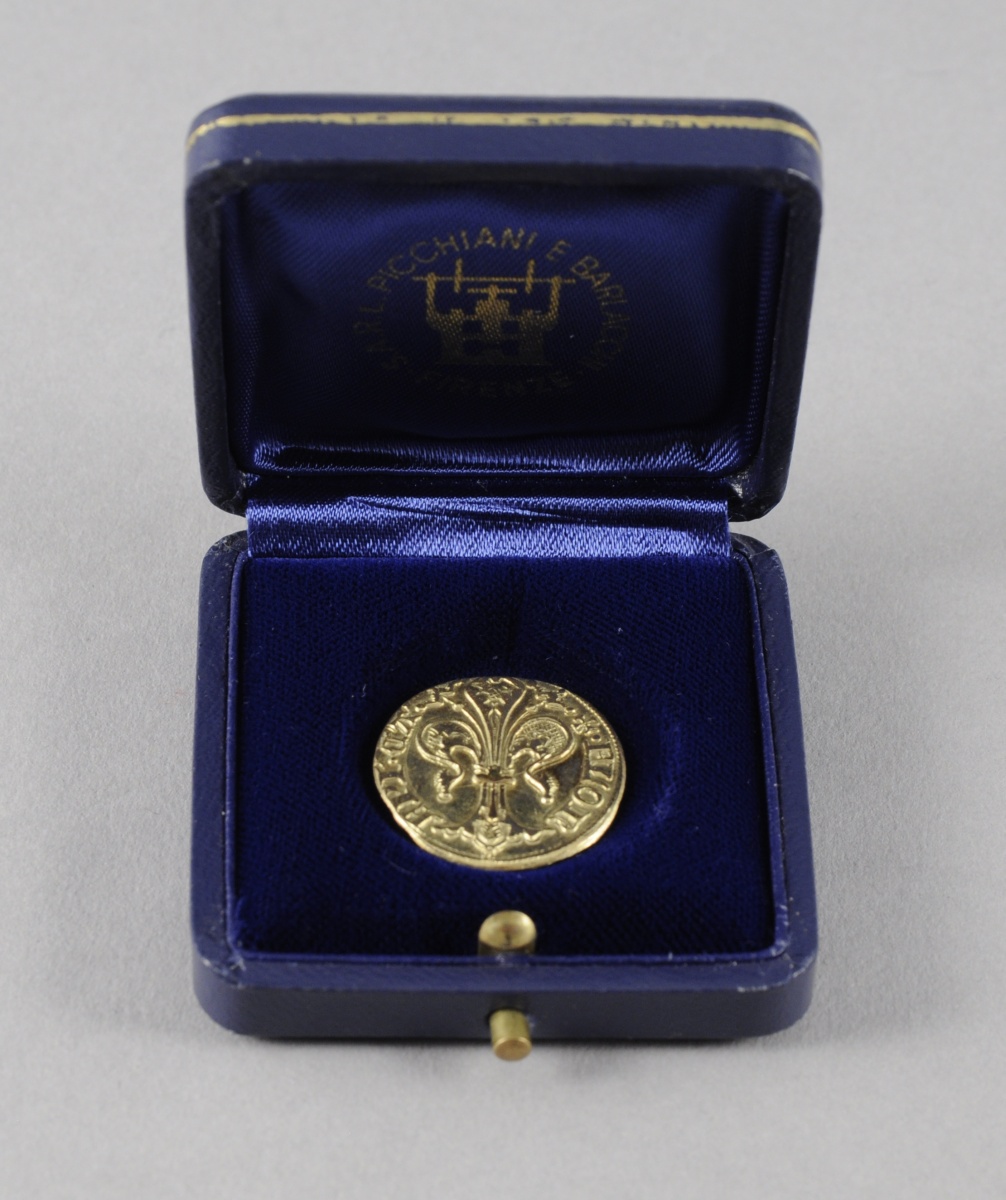 Mention manuscrite, sur un papier : "Florin d'or de la ville de Florence / Remise au Palazzo Vecchio par le Maire de Florence à l'occasion du 10ème anniversaire des Commanderies Italiennes / Mars 1968 (2-5)".
