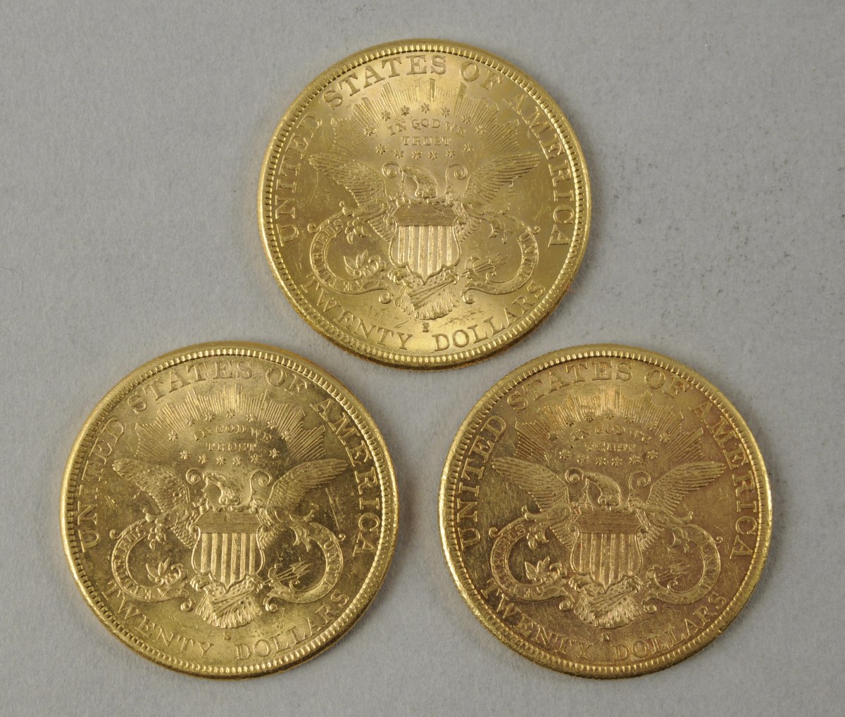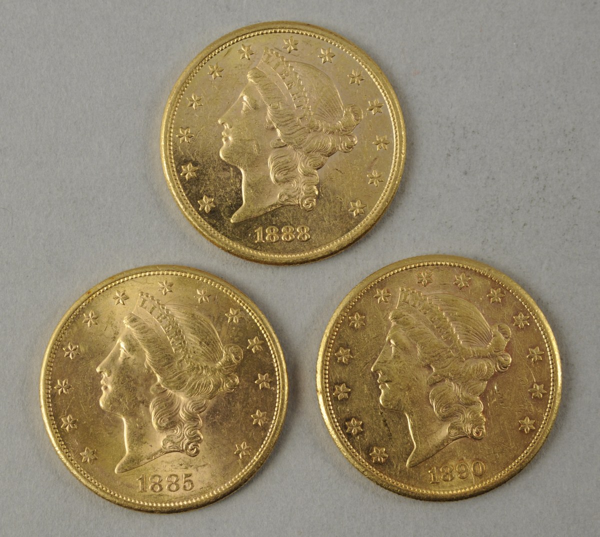 LOT, USA : trois pièces de 20 dollars or, 1885, 1888, 1890. (San Francisco) TTB/SUP
