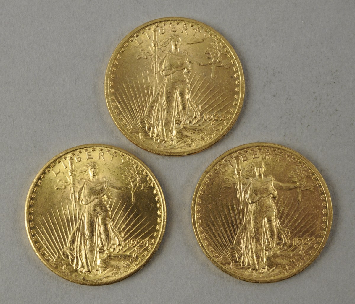 LOT, USA : trois pièces de 20 dollars or, deux de 1922 et 1924. SUP