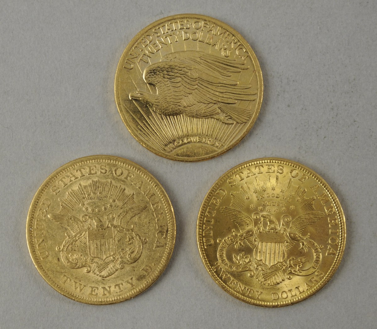 LOT, USA : trois pièces de 20 dollars or, 1861, 1904 et 1922. TTB