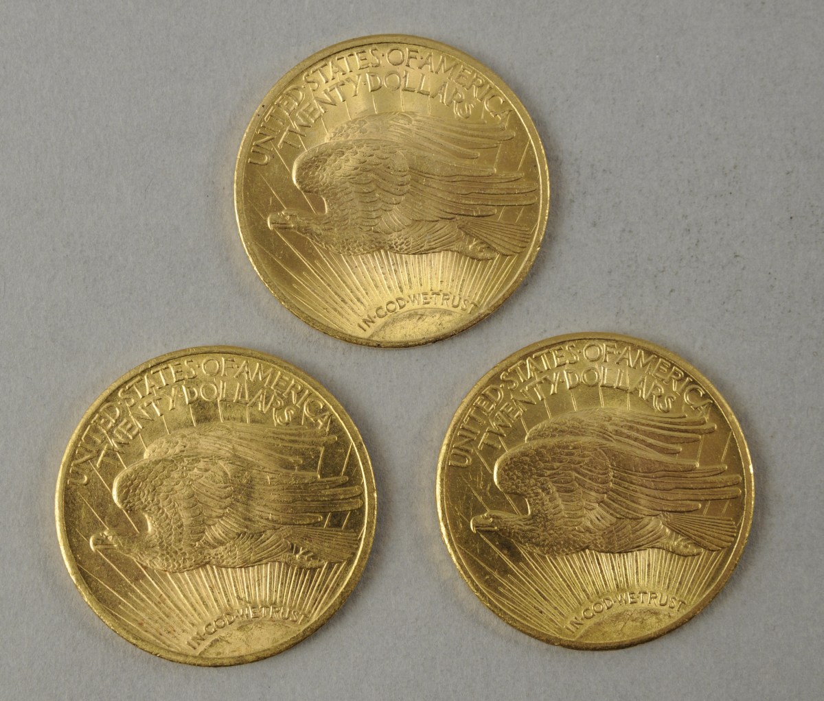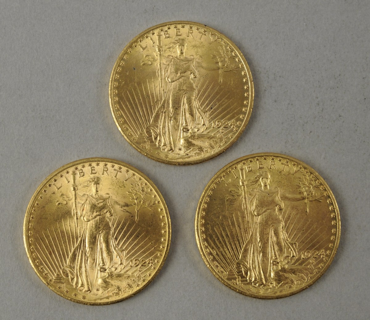 LOT, USA : trois pièces de 20 dollars or, 1924. TTB