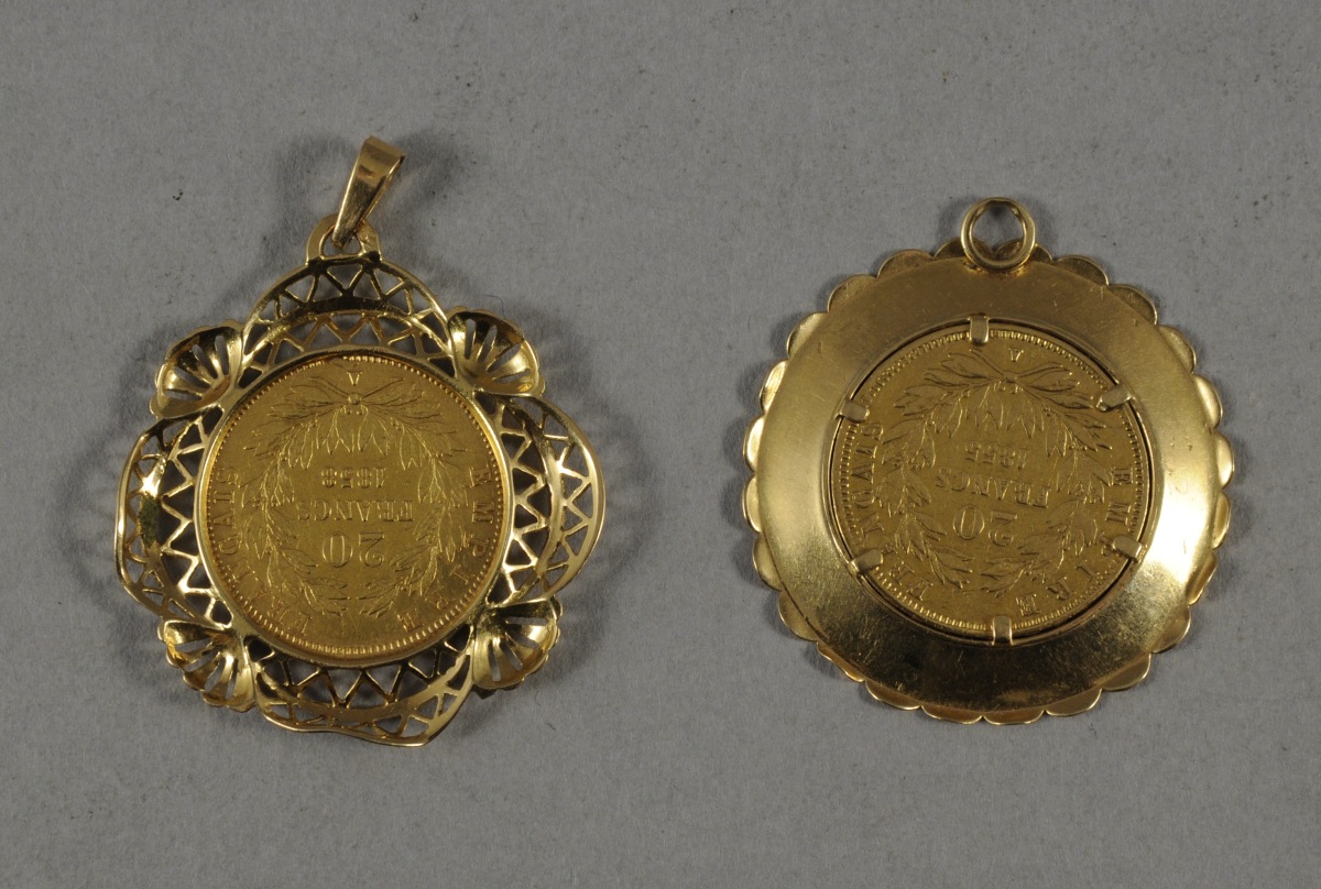 -Le second présente une ornementation ajourée de dents de loup sur les quatre lobes principaux et de godrons sur les quatre autres. Il est serti, en son centre, d'une pièce de 20 F or de 1858 figurant Napoléon III tête nue. Diam. 3,3 cm. Poids : 9,4 g.