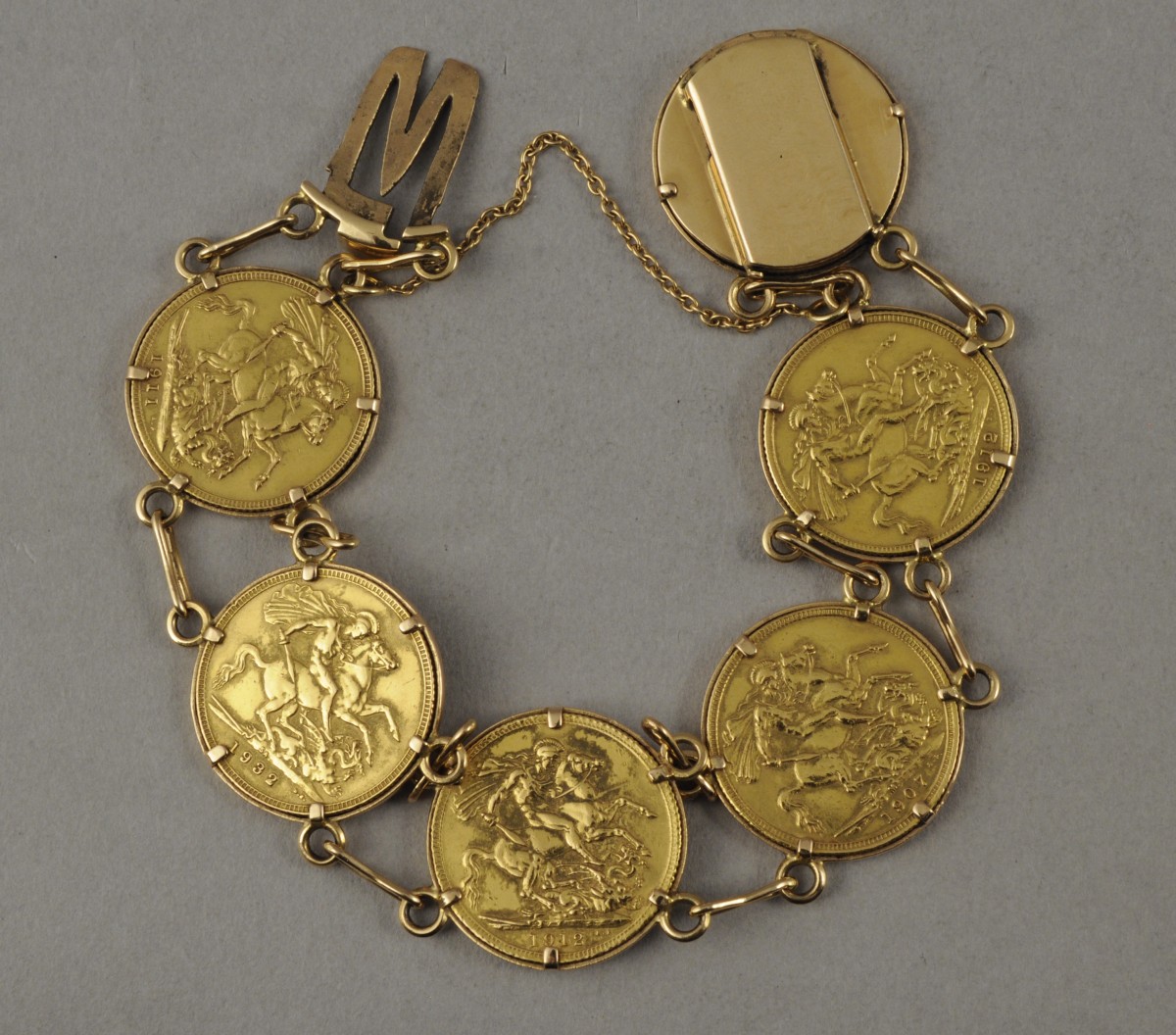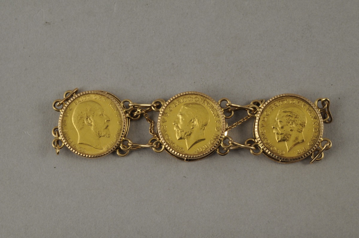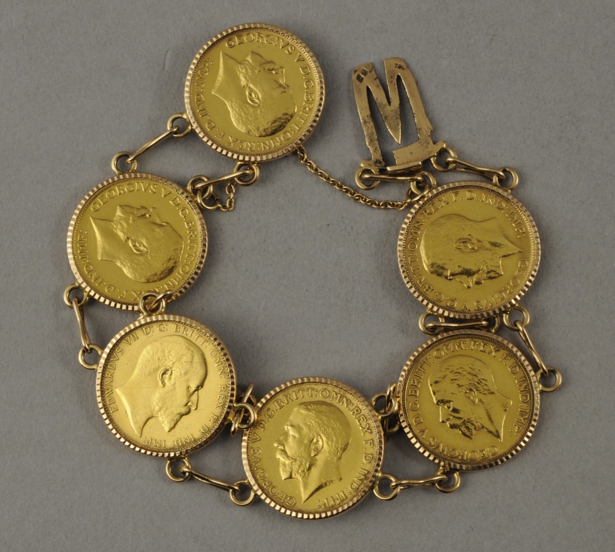 BRACELET or composé de six souverains britanniques (Edouard VII, 1907 ; Georges V 1911, 1912, 1932). Long. 20 cm. Monture : 17,5 g (750/1.000).