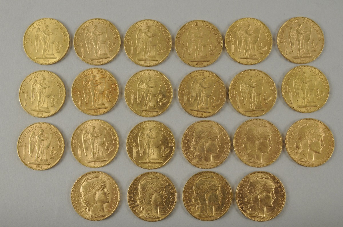 FRANCE, 22 pièces de 20F or, IIIeme Republique : 15 Génie, 7 Coq.