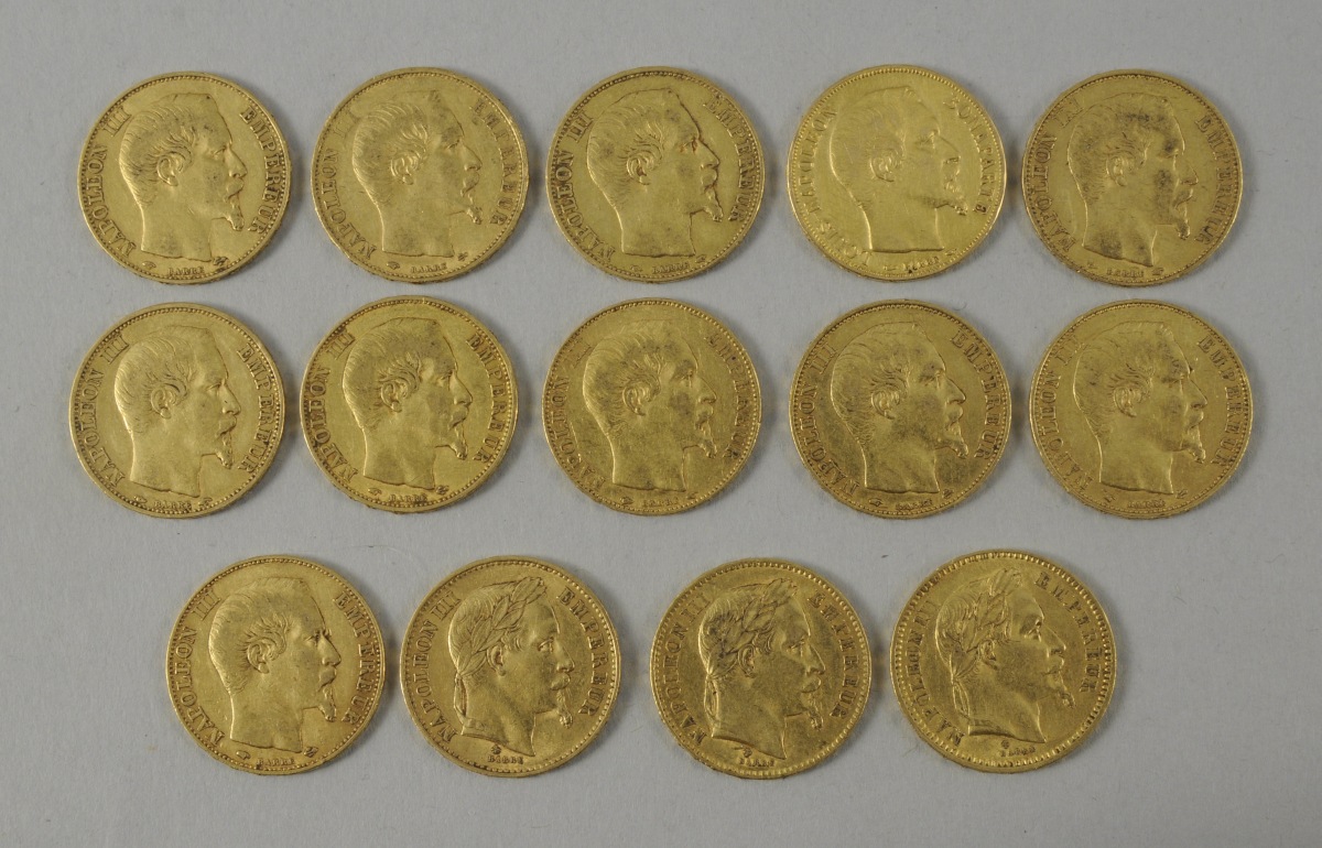 FRANCE, 14 pièces de 20F or, Napoléon III : 11 tête nue, 3 tête laurée.