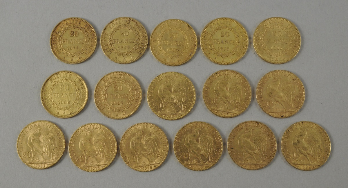 FRANCE, 16 pièces de 20F or, IIIeme République : 7 Génie, 9 Coq.