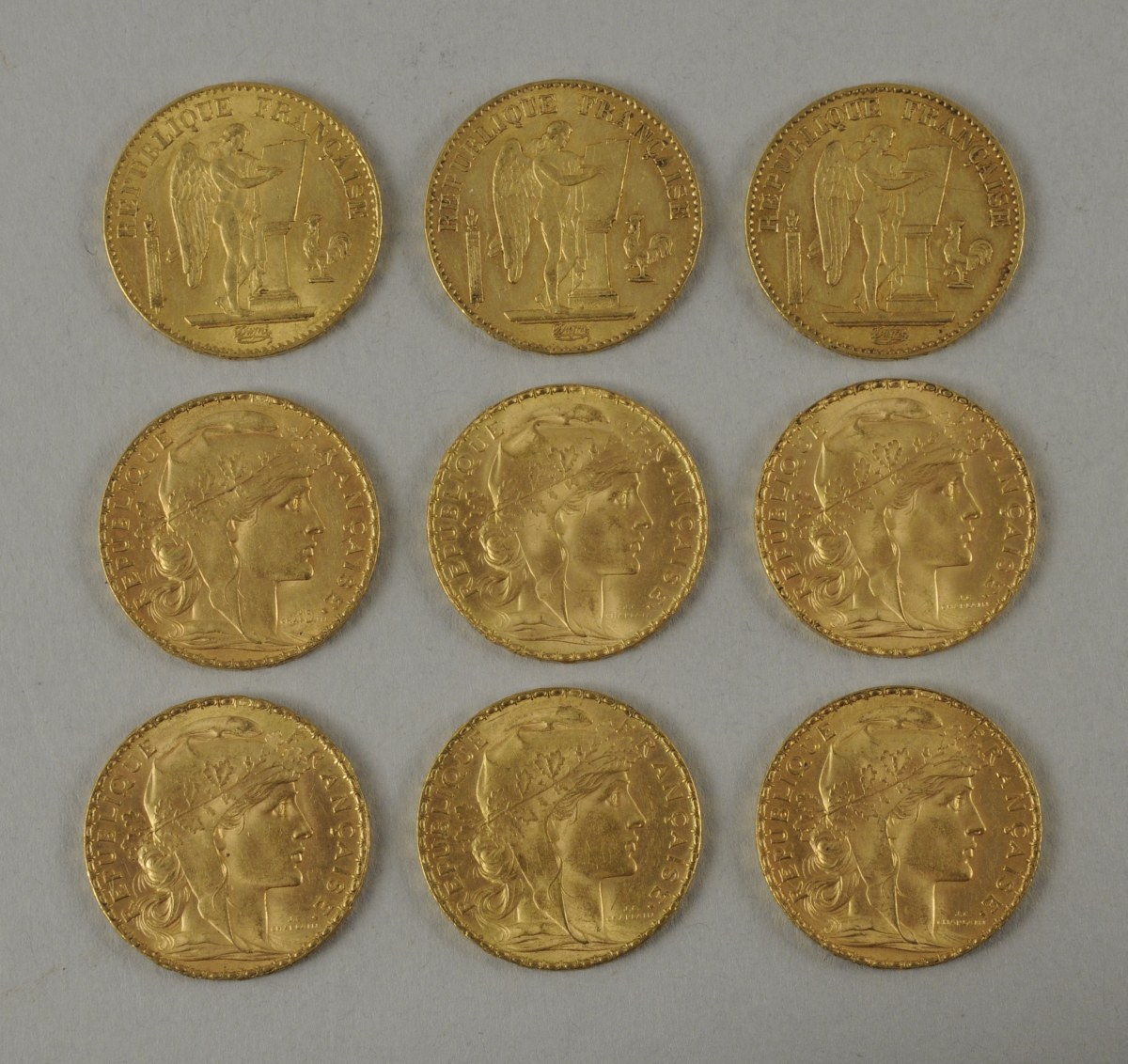 FRANCE, 9 pièces de 20F or, IIIème République : 3 Génie, 6 Coq.