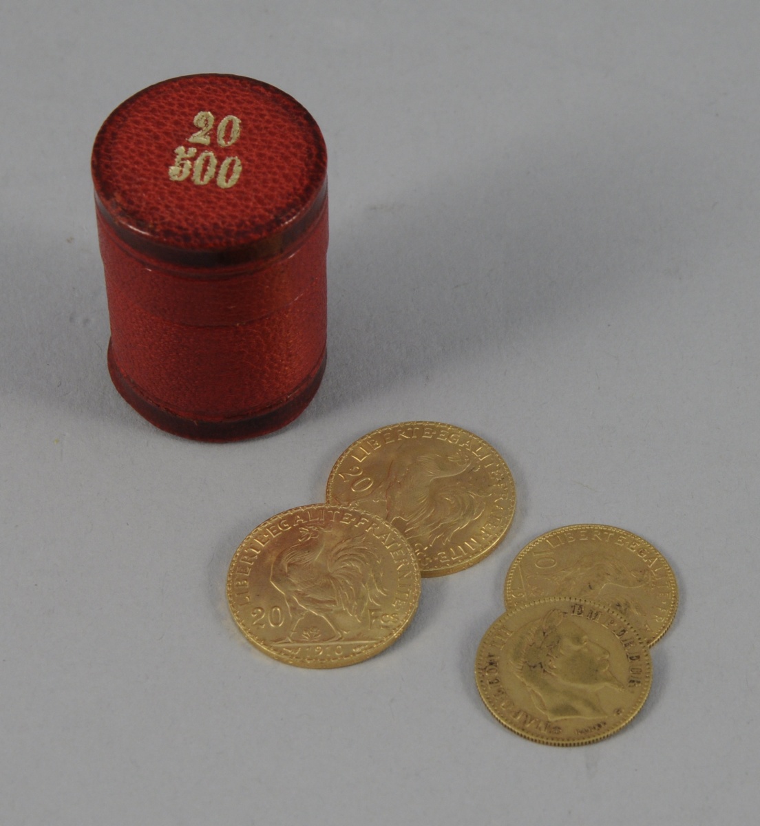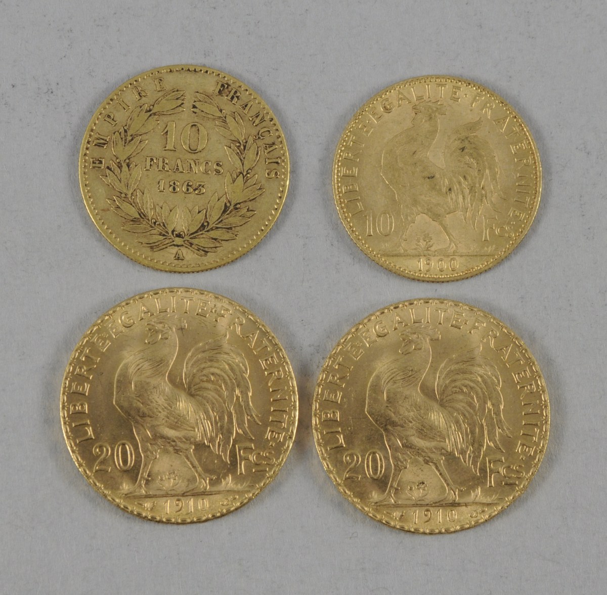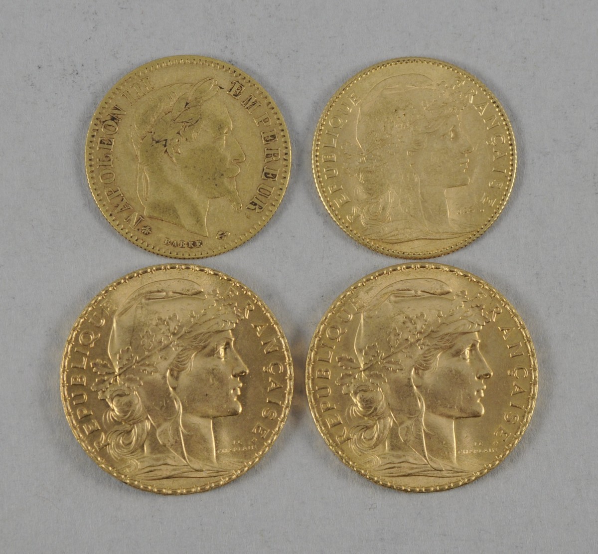 FRANCE, 4 pièces or : 2 pièces 20F or IIIème République au Coq - 2 pièces 10F or : Napoléon III lauré, IIIème République au Coq.