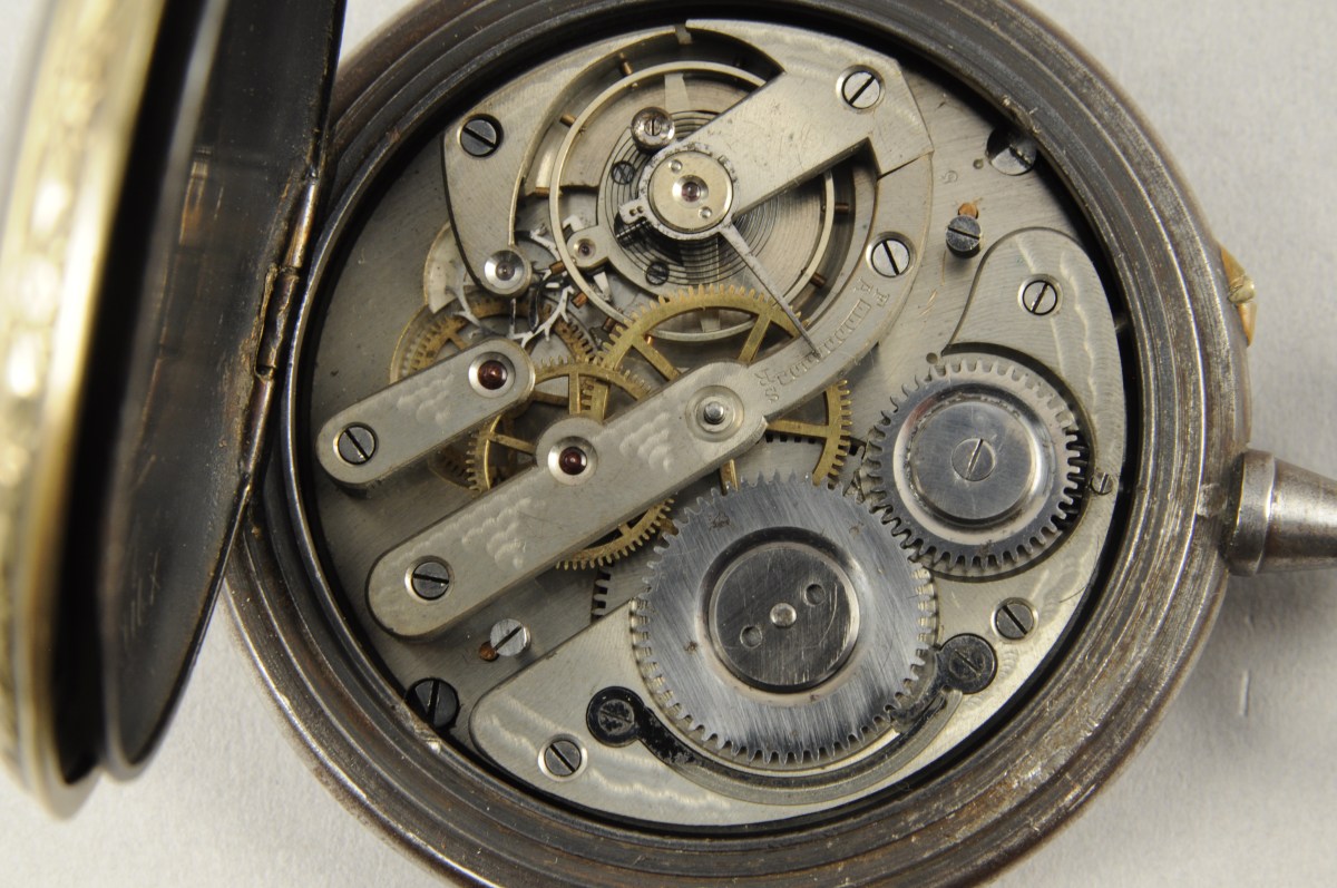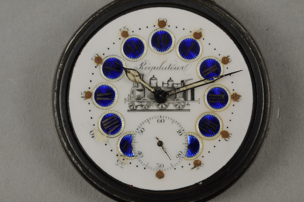 RÉGULATEUR DE CHEMIN DE FER à remontoir au pendant en acier. Double cadran émaillé blanc indiquant les heures en chiffres romains dans des cartouches en émail bleu translucide et les secondes. Le fond orné d'une locomotive et marqué "Régulateur". Le cadran et le dos du boîtier cerclés d'une frise de fleurons et losanges.