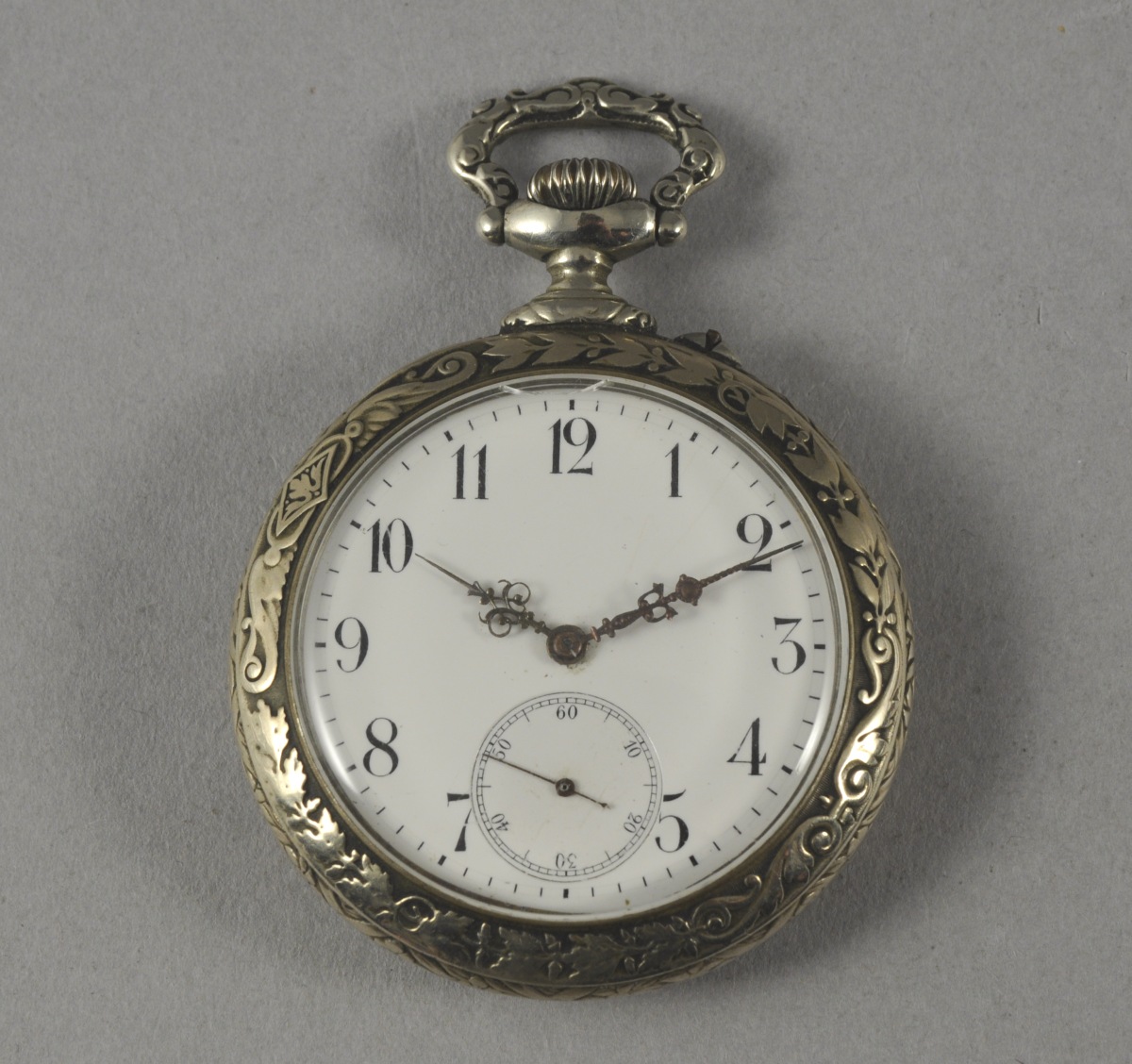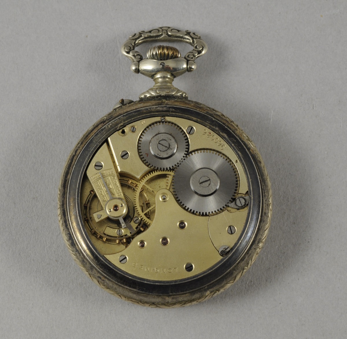 MONTRE DE GOUSSET à remontoir au pendant en métal argenté. Double cadran émaillé blanc indiquant les heures en chiffres arabes et les secondes. Le tour du cadran orné d'une couronne de chêne et laurier. Le dos du cadran à riche décor d'un trophée de l'agriculture notamment composé de fléaux, faux, rateau, seau et d'un chapeau dans un encadrement de feuillages stylisés. L'anneau de bélière de forme chantournée. Mouvement à échappement à ancre signé "LONGINES".