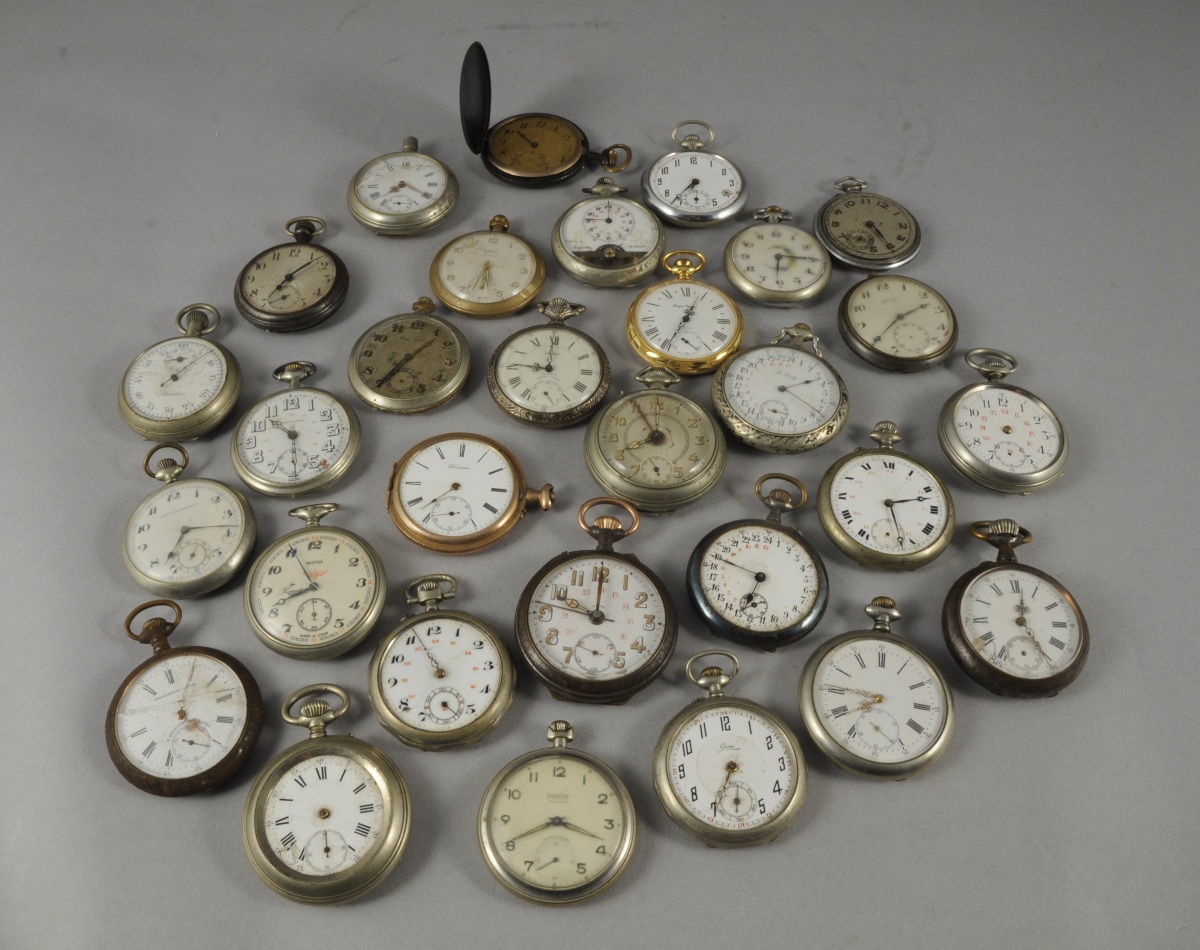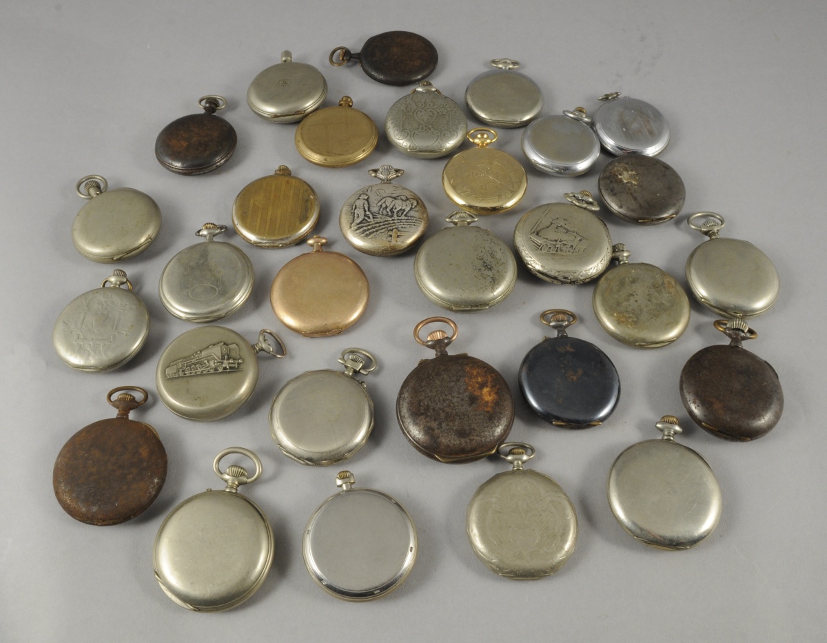 LOT DE 30 MONTRES DE GOUSSET à clef ou à remontoir au pendant en métal, métal argenté, métal doré, argentan ou acier. Il comprend notamment un Chronomètre Galilée, une à cadran en métal guilloché, une à spiral Bréguet levées visibles huit jours à échappement à ancre, une signée "Mougin Piquard", une dont le boîtier est orné d'une locomotive...