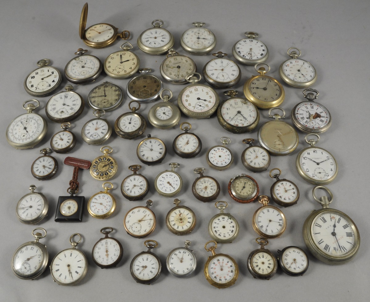 LOT DE 52 MONTRES DE GOUSSET OU DE COL à clef ou à remontoir au pendant en métal, métal argenté, métal doré, argentan ou acier. Il comprend notamment un régulateur, une signée de la maison "Delta", une autre signée "Record Watch Co", trois à cadran triple, une dont le boîtier est orné d'un riche décor naturaliste, plusieurs à cadran en métal guilloché, une dont le dos du boîtier est marqué "Ministère de la Guerre N°610", deux dont le mécanisme est gravé "Le Petit Journal"...
