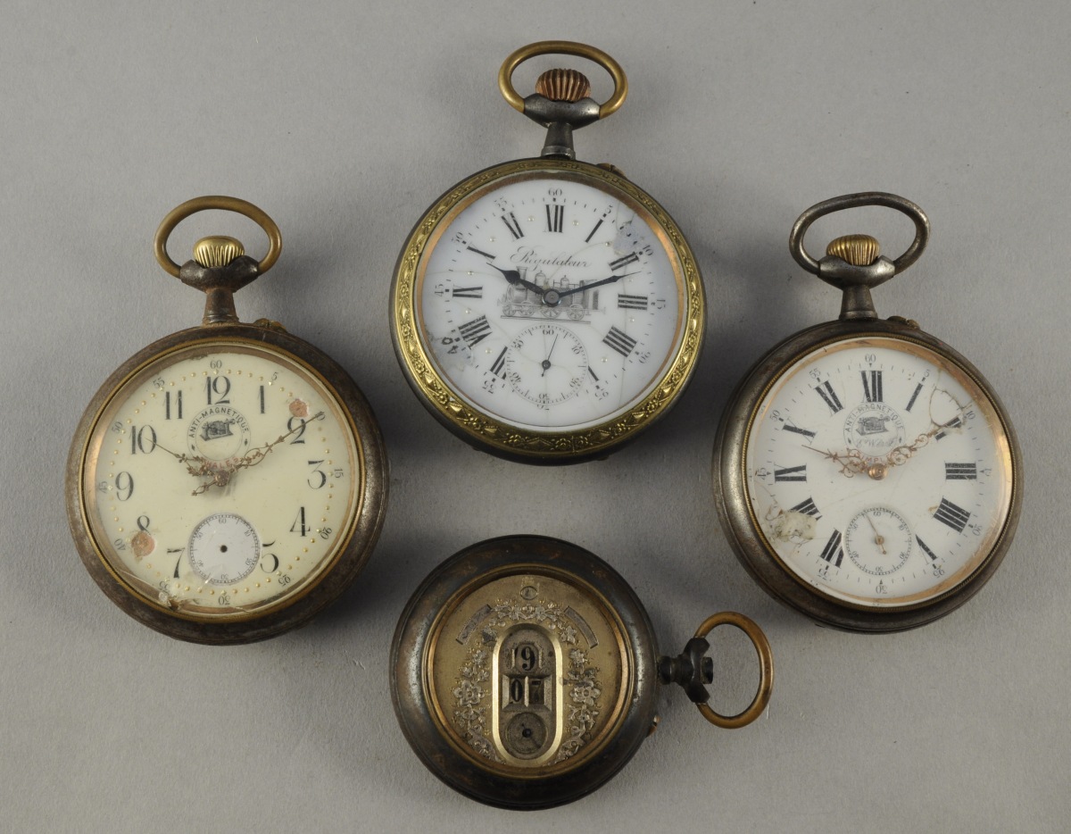 -Le premier à double cadran émaillé blanc indiquant les heures en chiffres romains, les minutes en chiffres arabes et les secondes. Il est orné d'une locomotive et marqué "Régulateur". Le cadran et le dos du boîtier cerclés d'une frise de losanges alternant avec des fleurs.