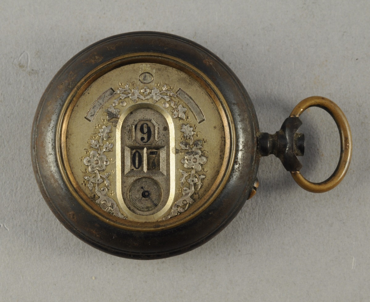JOINT : MONTRE DE GOUSSET à remontoir au pendant en acier. Le cadran en métal présente un cartouche creux de forme oblongue flanqué de guirlandes feuillagées. Il contient une ouverture de forme octogonale affichant le quantième, deux ouvertures pour le mois et un cadran circulaire indiquant les dizaines de secondes en chiffres arabes.