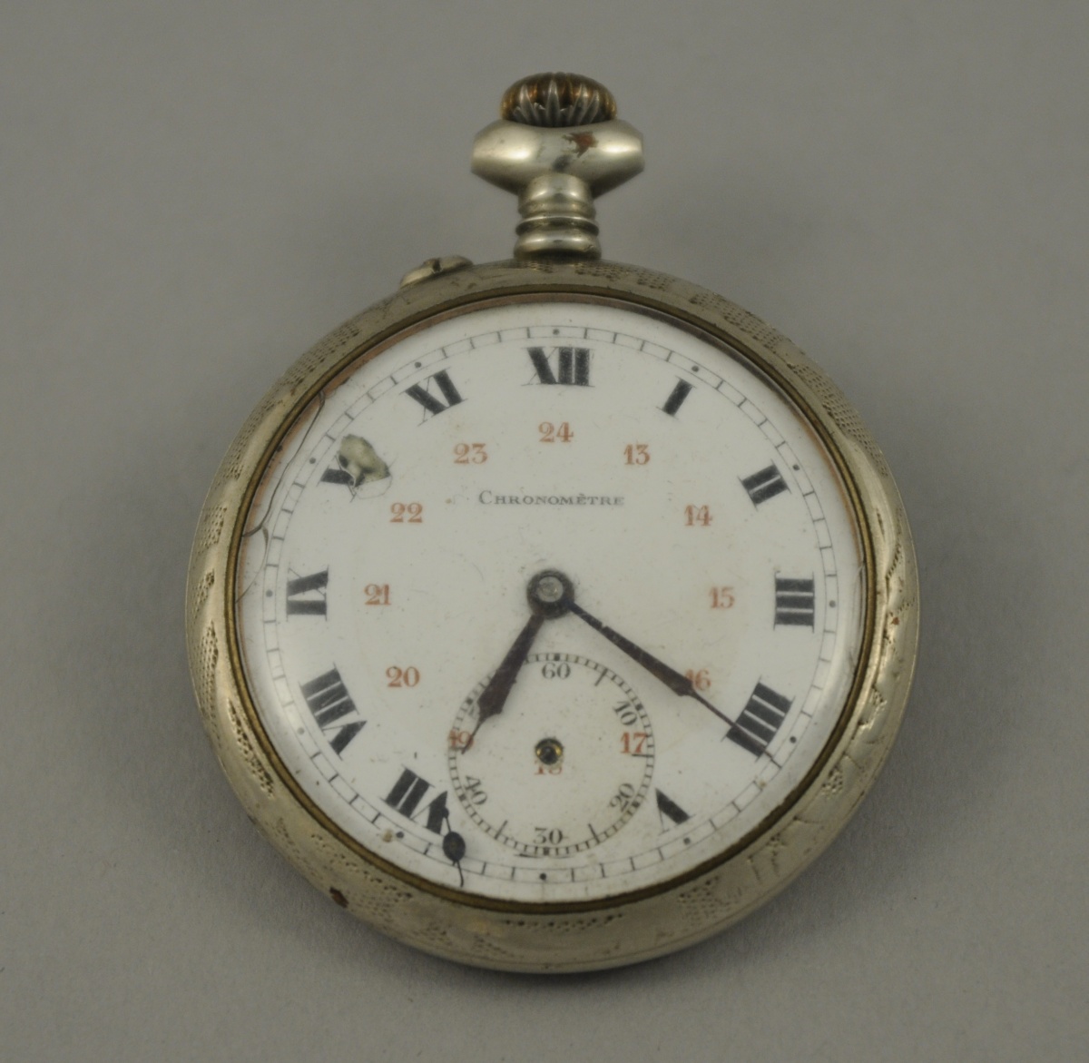 -UNE MONTRE DE GOUSSET CHRONOMÈTRE en métal à double cadran émaillé blanc indiquant les heures en chiffres romains et arabes et les secondes. Le dos du boîtier à décor d'un écu, de guirlande de fleurs et d'agrafes sur fond orné de guillochis.