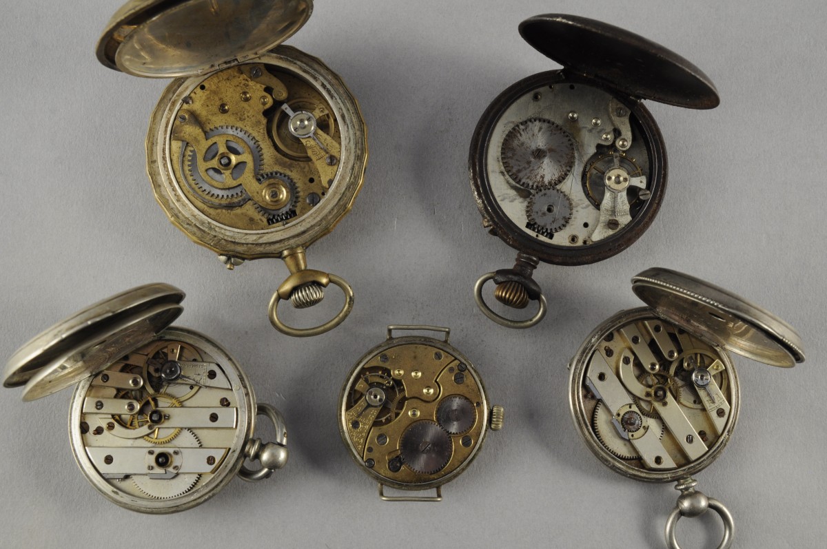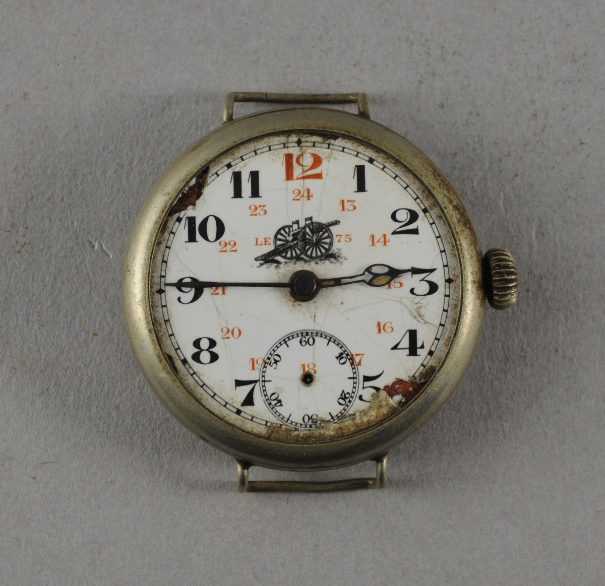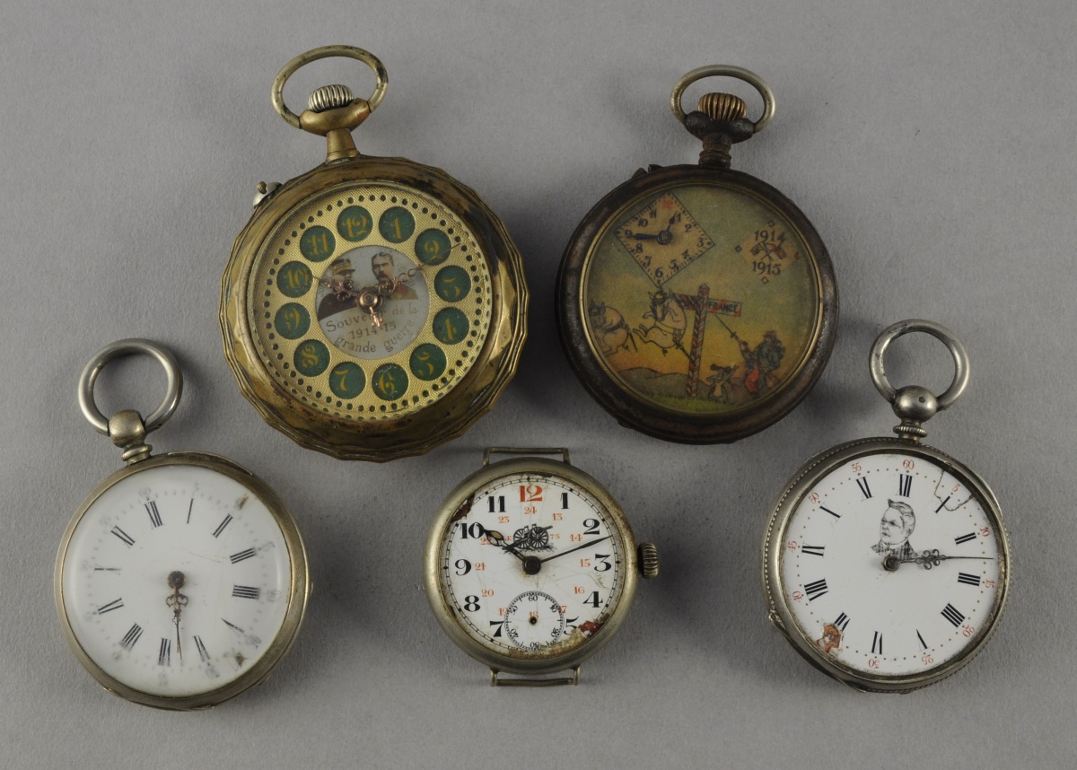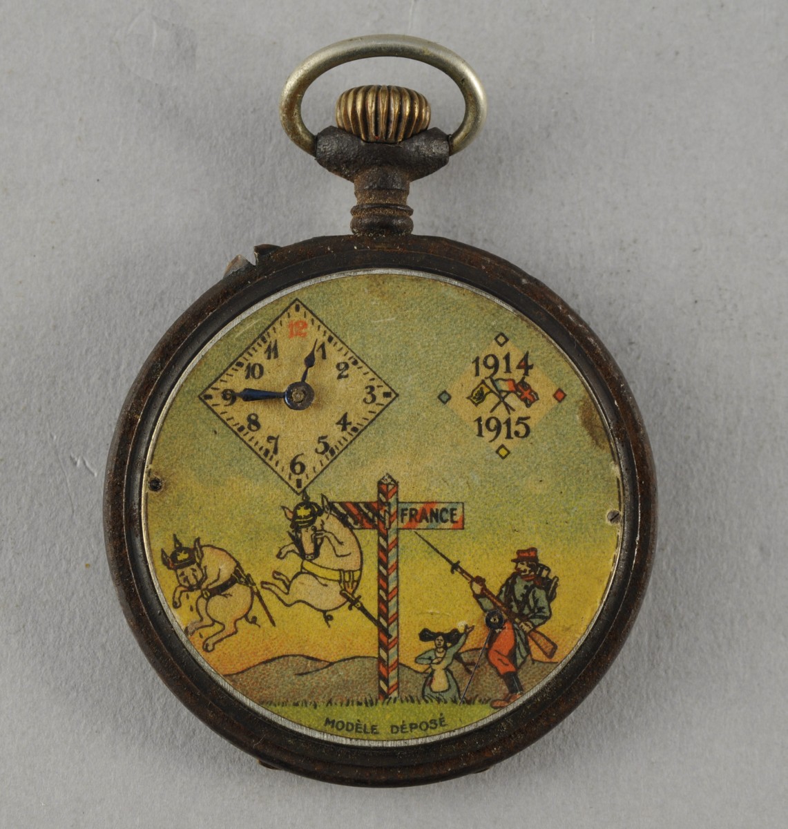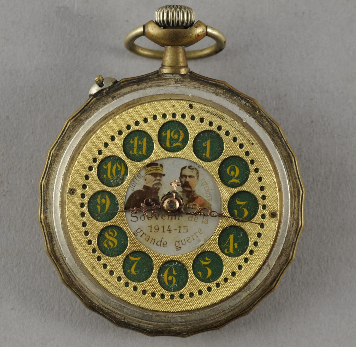 -La quatrième, à remontoir au pendant, en métal anciennement argenté. Le cadran émaillé vert indique les heures en chiffres arabes dans un encadrement en métal or. Le fond du cadran en orné d'une chromolithographie de forme ronde figurant les maréchaux Joffre et Kitchener. Elle porte la mention "Souvenir de la grande guerre / 1914-15". Le dos du boîtier orné de feuillages stylisés. Le cache-poussière marqué "Remontoir perfectionné".
