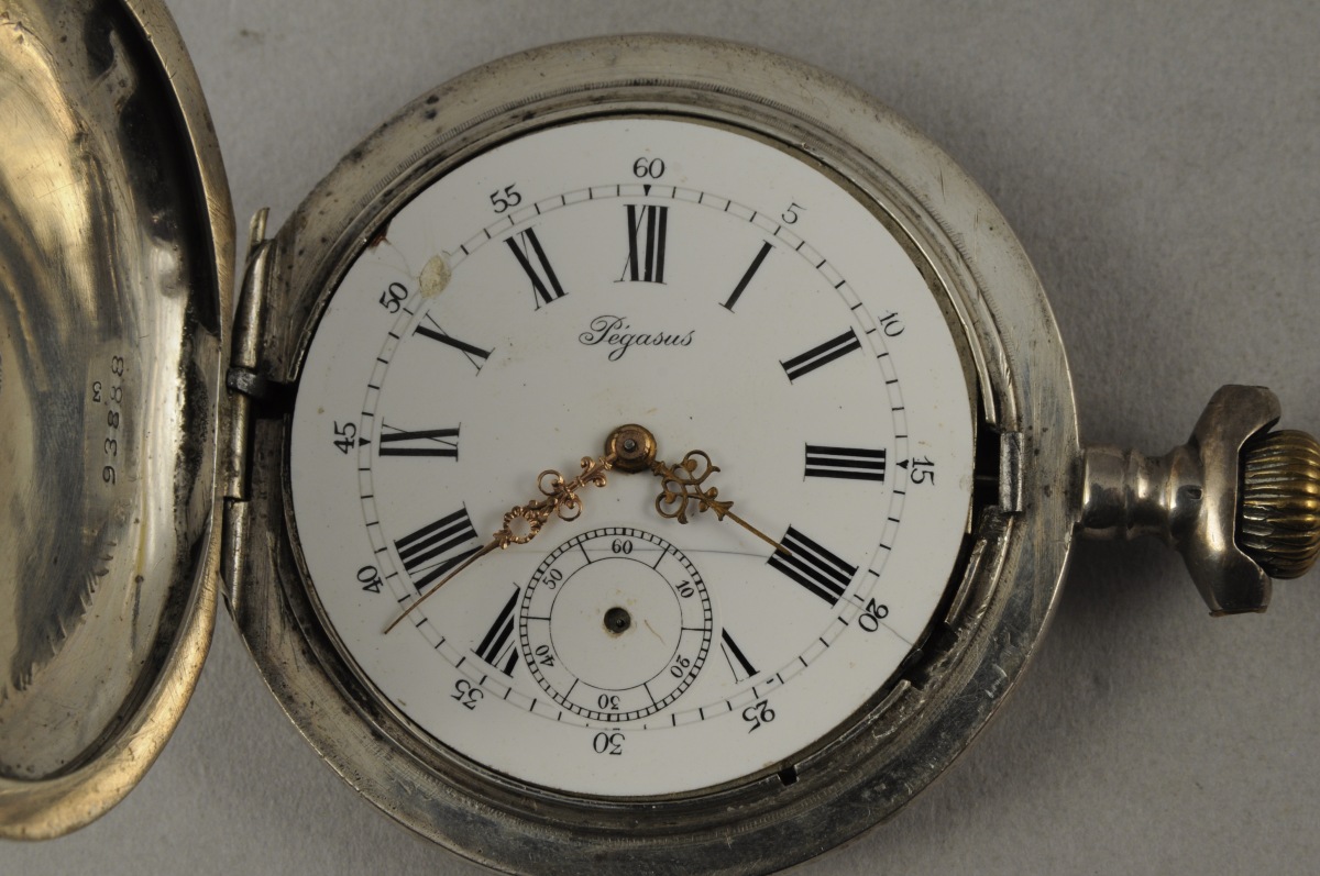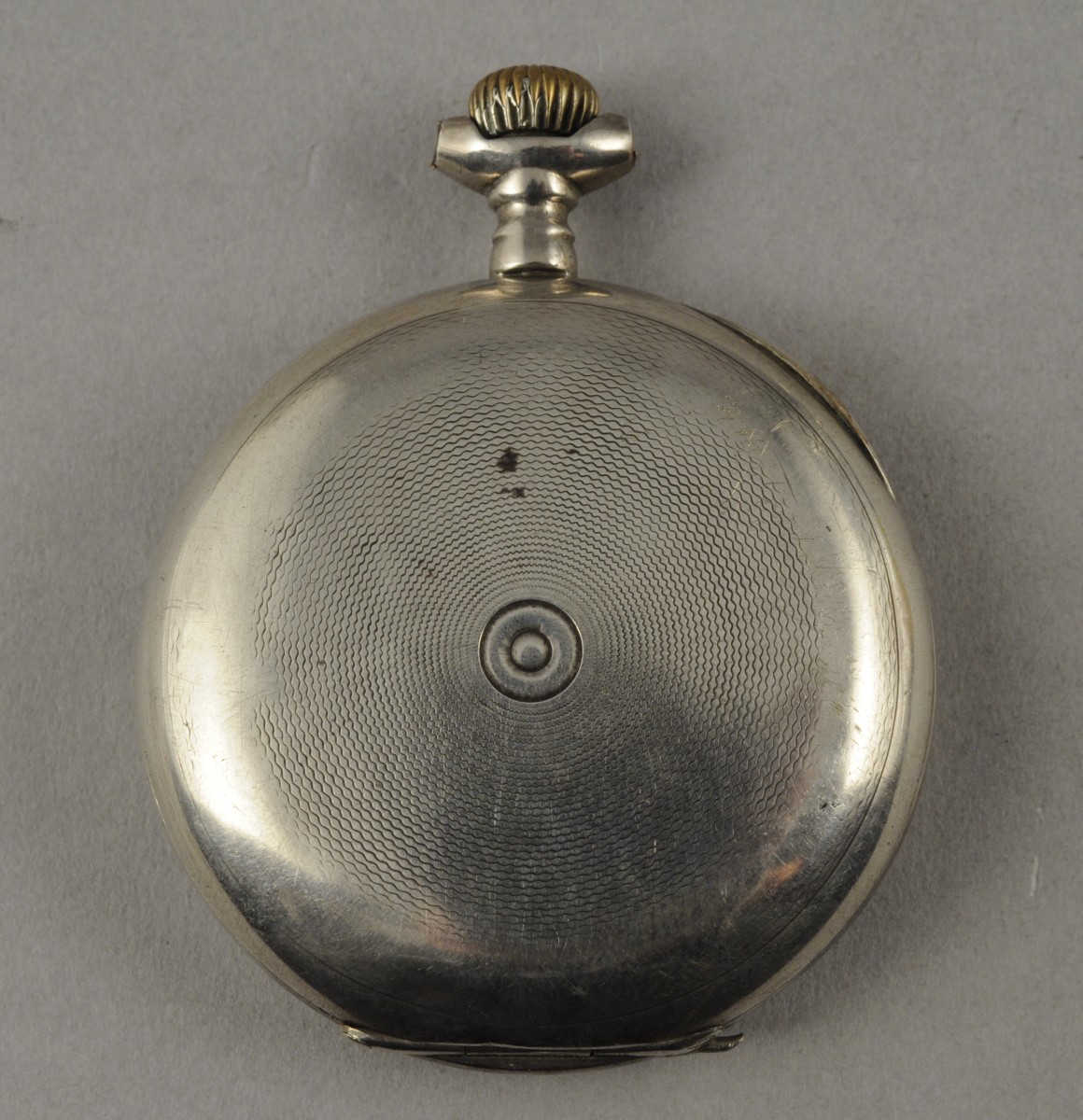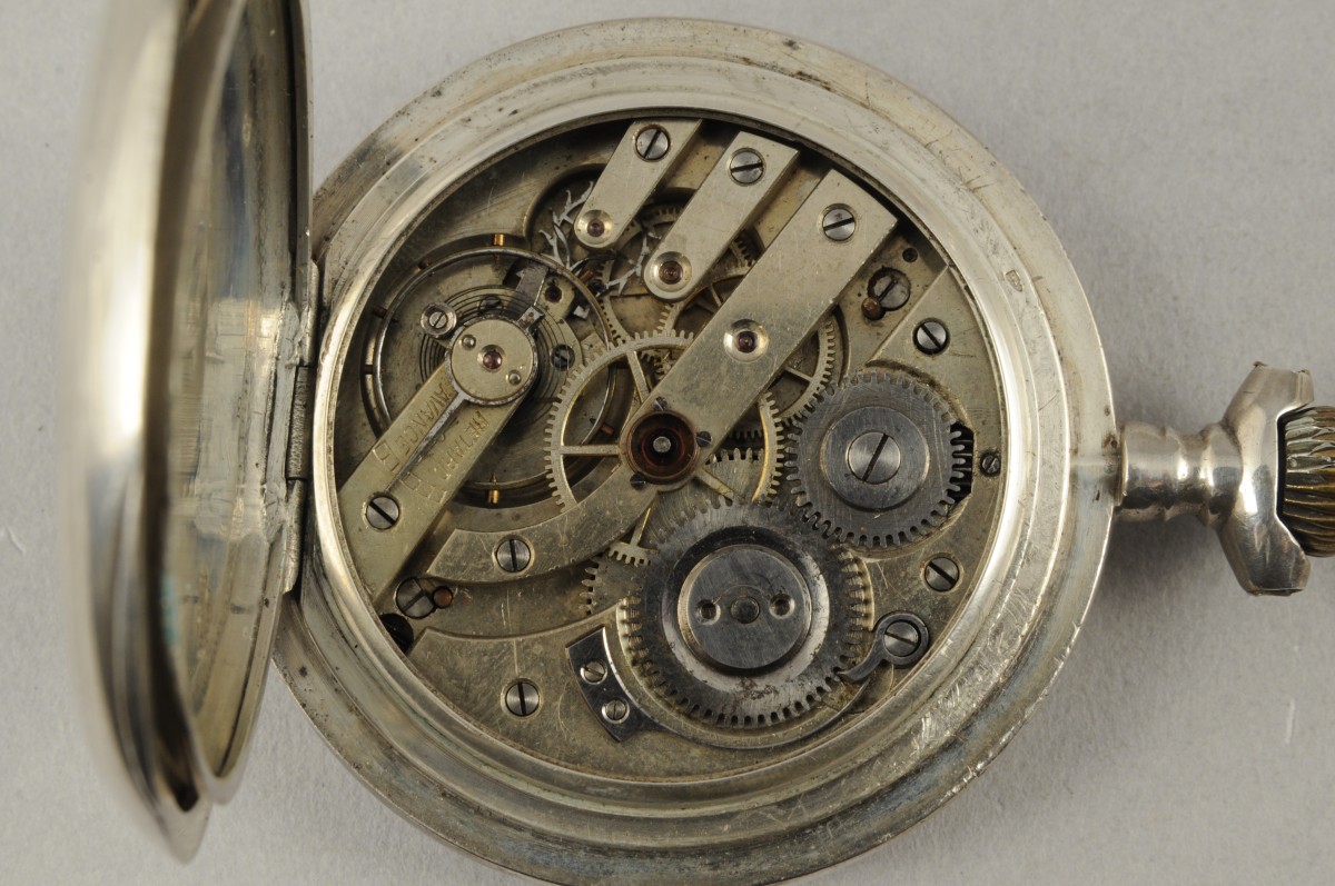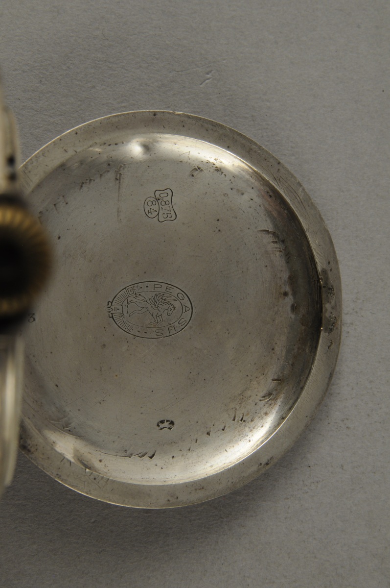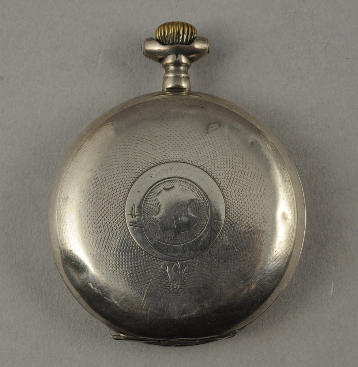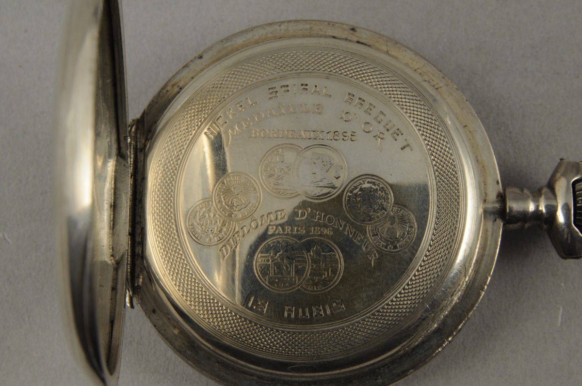 MONTRE DE GOUSSET à remontoir au pendant en argent. Le clapet orné d'un écu inscrit dans un cercle sur fond guilloché. Il découvre un double cadran émaillé blanc indiquant les heures en chiffres romains, les minutes en chiffres arabes et les secondes. Le dos du boîtier guilloché. Le cache-poussière gravé "Nickel spiral Breguet / 15 rubis / Médaille d'or / Bordeaux 1895 / Diplôme d'honneur / Paris 1896". Travail de la maison "PÉGASUS".