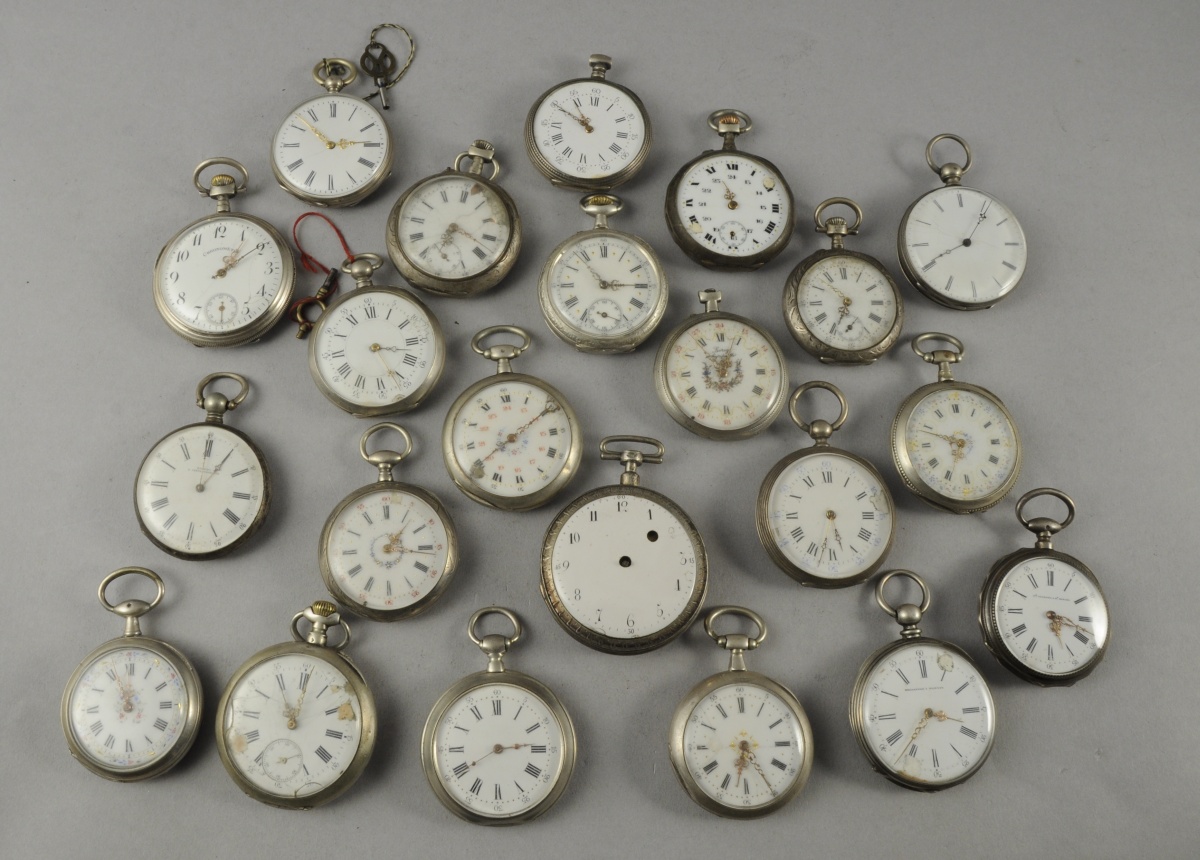 LOT DE 22 MONTRES DE GOUSSET en argent, à clef ou à remontoir au pendant. Il comprend notamment un chronomètre, plusieurs à cadran double, une dont le boîtier est orné d'une croix et d'une ancre croisées sur un coeur, plusieurs dont le cadran présente un décor émaillé polychrome...