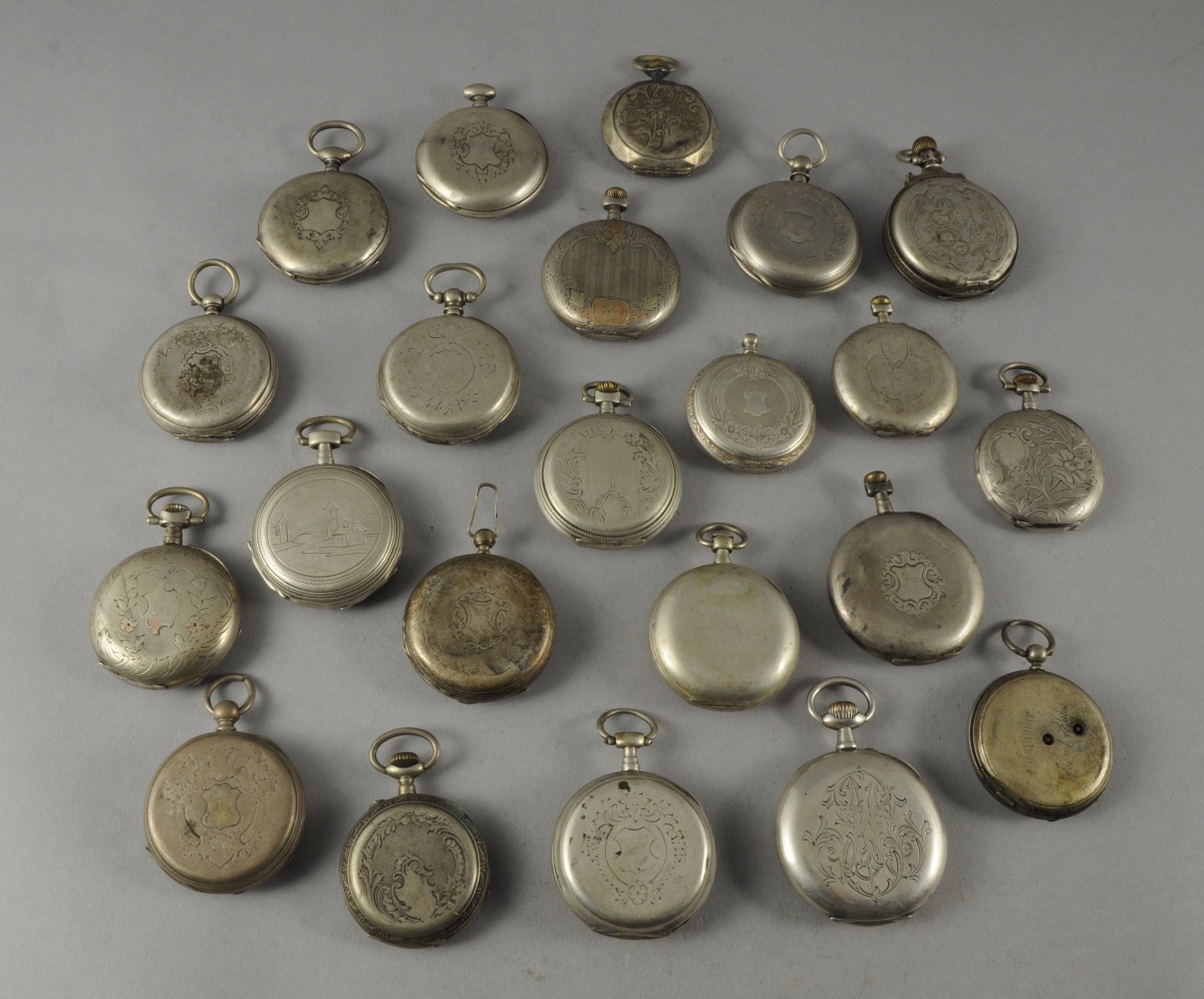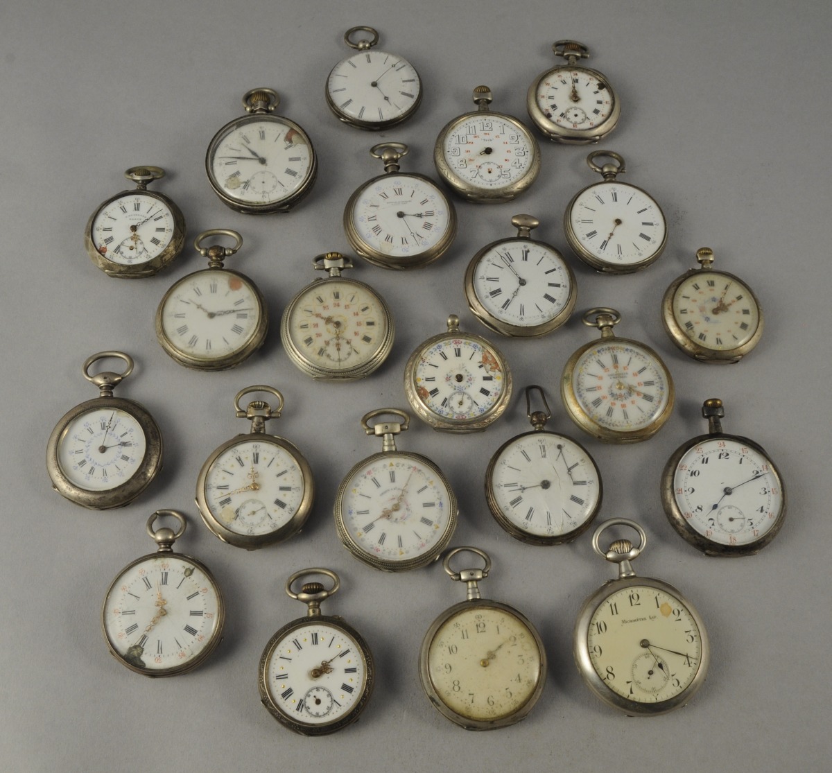 LOT DE 22 MONTRES DE GOUSSET en argent, à clef ou à remontoir au pendant. Il comprend notamment un Micromètre "LIP" dont le boîtier est monogrammé "MJ", plusieurs à cadran double, une dont le cache-poussière est gravé "Ancre ligne droite / Remontoir 22 Rubis" et dont le mécanisme est entièrement ciselé de rinceaux, une présentant un décor floral laqué or...