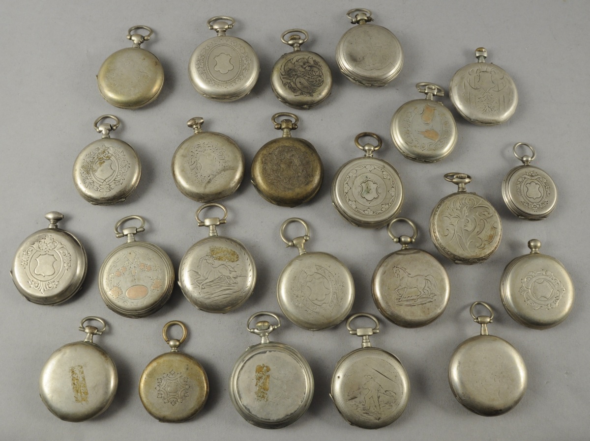 LOT DE 23 MONTRES DE GOUSSET en argent, à clef ou à remontoir au pendant. Il comprend notamment une signée "La Semeuse", plusieurs à cadran double, une dont le dos du boîtier est ciselé d'une vue de l'église de St Hilaire du Harcouët, plusieurs dont le cadran est émaillé de guirlandes de fleurs polychromes, deux dont le dos du boitier est ciselé d'un cheval...