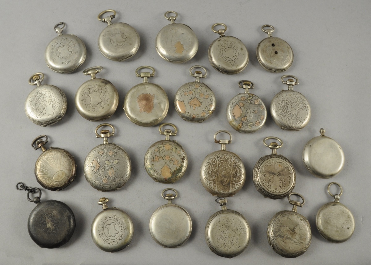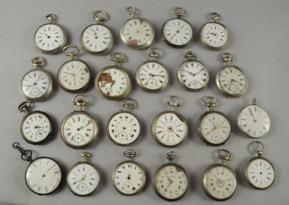LOT DE 23 MONTRES DE GOUSSET en argent, à clef ou à remontoir au pendant. Il comprend notamment une à décor d'un cheval galopant, plusieurs à cadran double, plusieurs dont le dos du boîtier présente un décor laqué or...