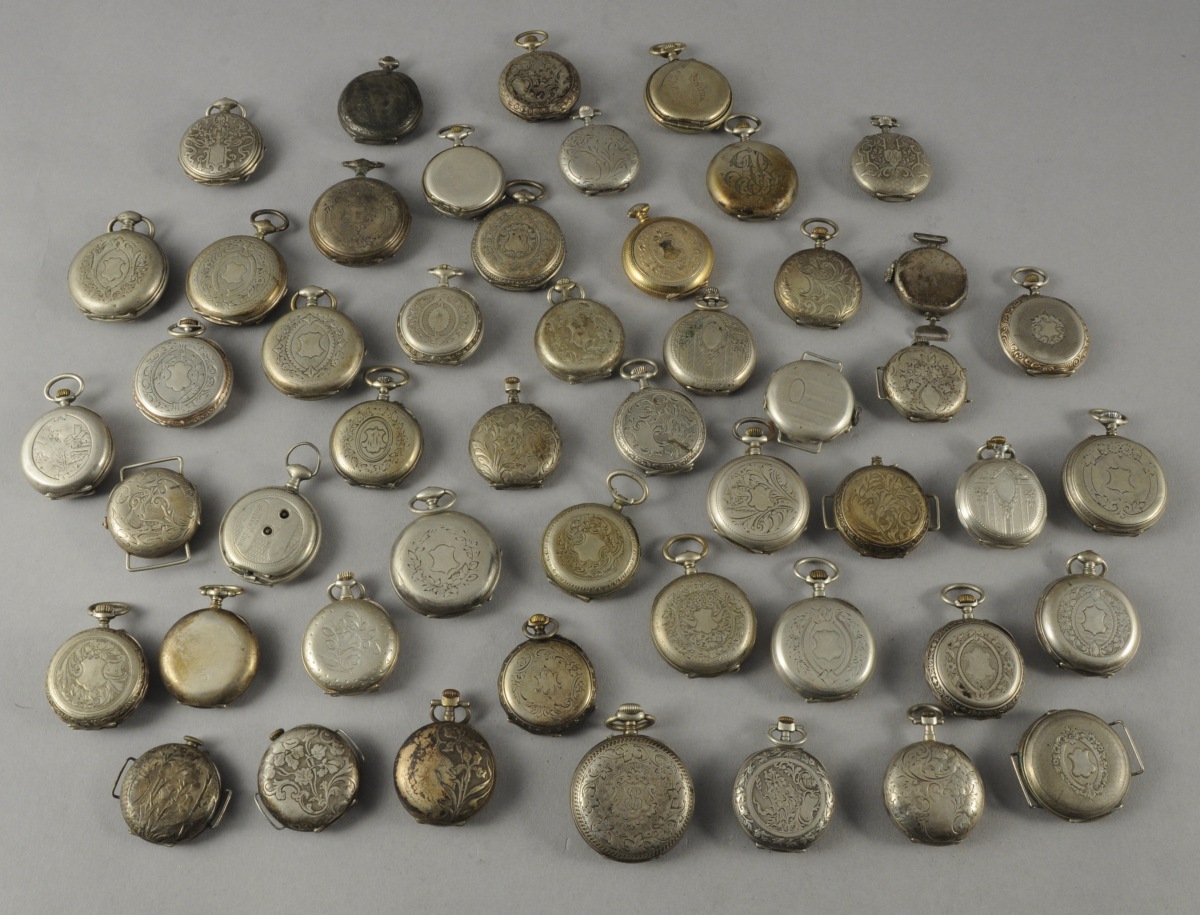 LOT DE 50 MONTRES DE COL OU MONTRES-BRACELET en argent, à clef ou à remontoir au pendant. Il comprend notamment une à décor d'un damier niellé, une signée de la maison "Croissant", plusieurs dont le cadran reçoit un décor de guirlandes de fleurs émaillées, une à cadran double, une en vermeil...