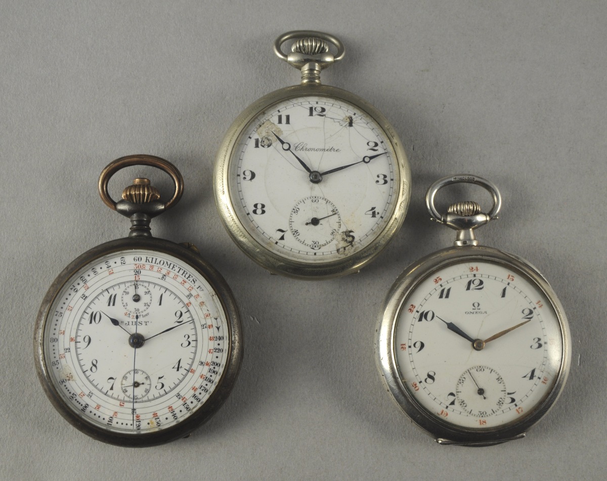 -La deuxième, en acier, est un chronomètre à triple cadran émaillé blanc indiquant chiffres et nombres en chiffres arabes rouges ou noirs. Signé "JUST".
