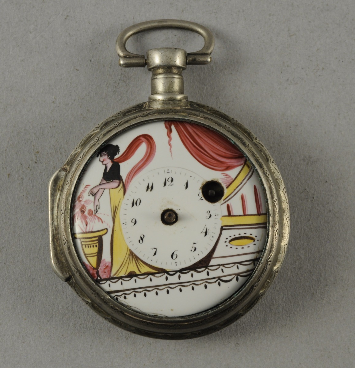 MONTRE À COQ en argent. Le cadran à décor émaillé jaune, pourpre et noir d' une femme habillée à l'Antique dans un intérieur. Coq à décor ajouré de rinceaux. Maître-Orfèvre PW, un oeil.