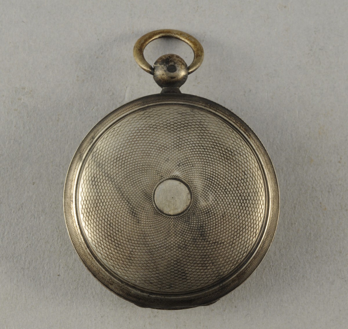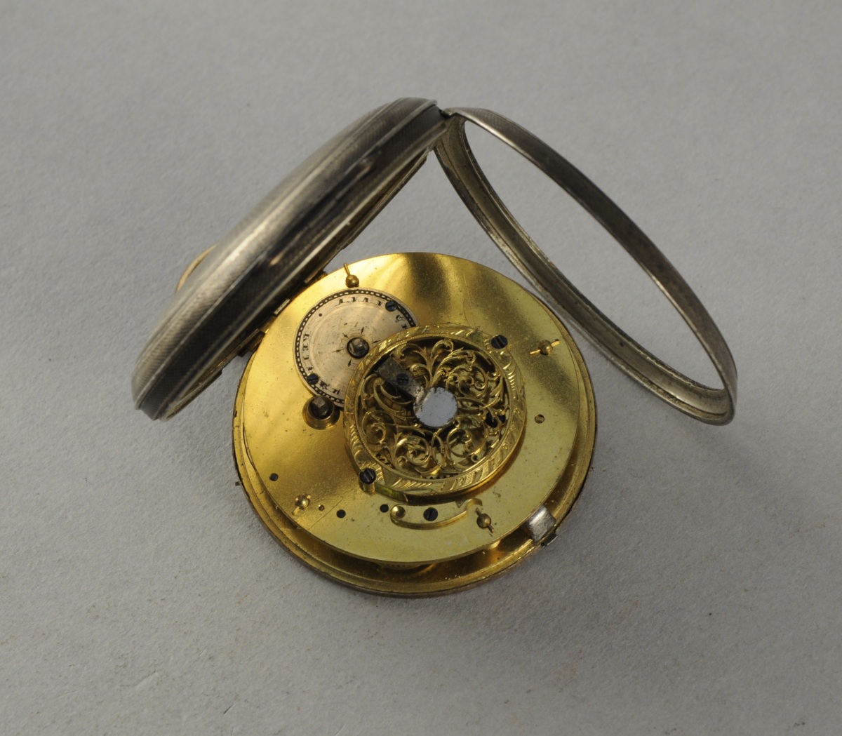 MONTRE À COQ en argent. Le cadran en argent guilloché indiquant les heures en chiffres romains. Le boitier à décor de guillochis. Coq à décor ajouré de rinceaux. Maître-Orfèvre AC. Poinçon Vieillard 2ème titre. Travail provincial entre 1819 et 1838.