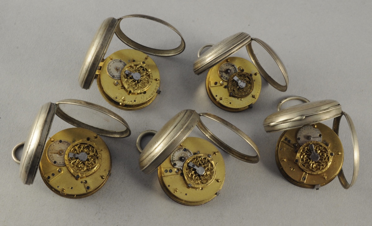 LOT DE 5 MONTRES À COQ en argent. Le cadran émaillé blanc indiquant les heures en chiffres romains. Le coq à décor ajouré de rinceaux.