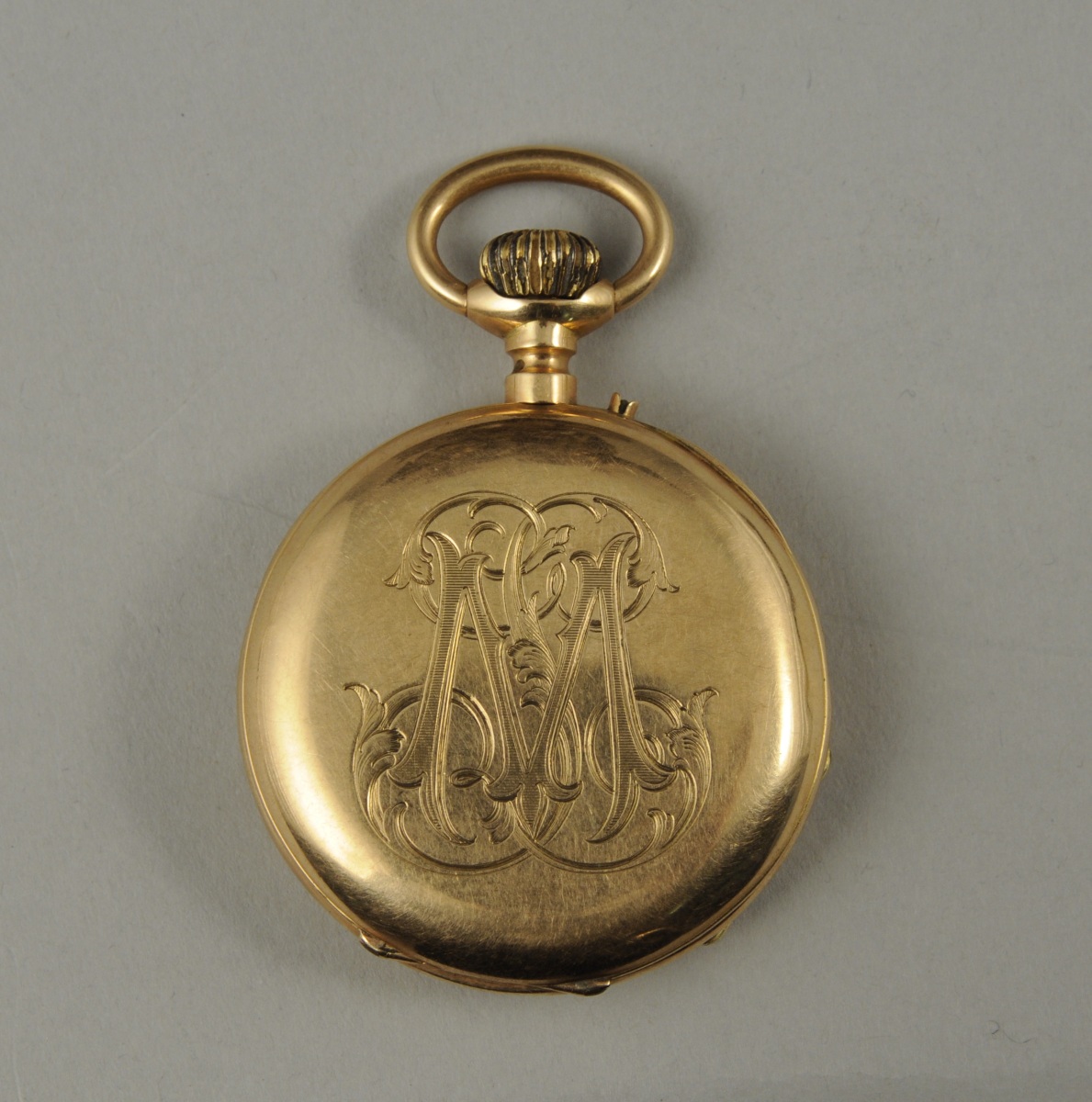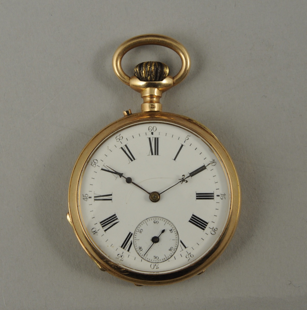 -La seconde à remontoir au pendant. Le cadran émaillé blanc indiquant les heures en chiffres romains et les minutes en chiffres arabes. Le dos du boîtier ciselé d'un cartouche figurant un oiseau volant au dessus de son nid sur fond guilloché. Poinçon d'orfèvre B, une tour, F.