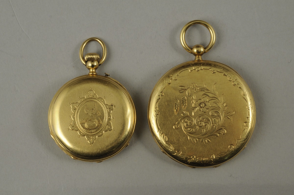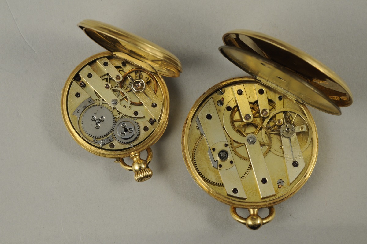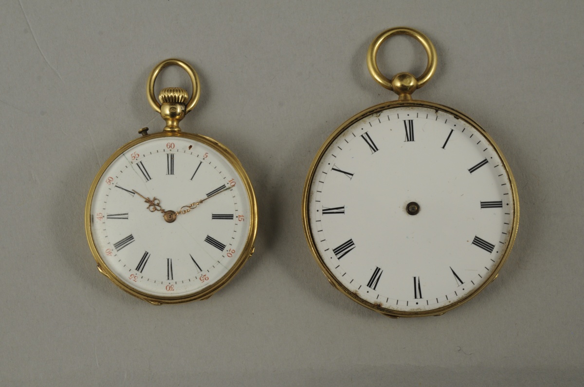 MONTRE DE GOUSSET en or rose à remontoir. Double cadran émaillé indiquant les heures en chiffre romains, les minutes en chiffres arabes et les secondes. Boîtier monogrammé MP.