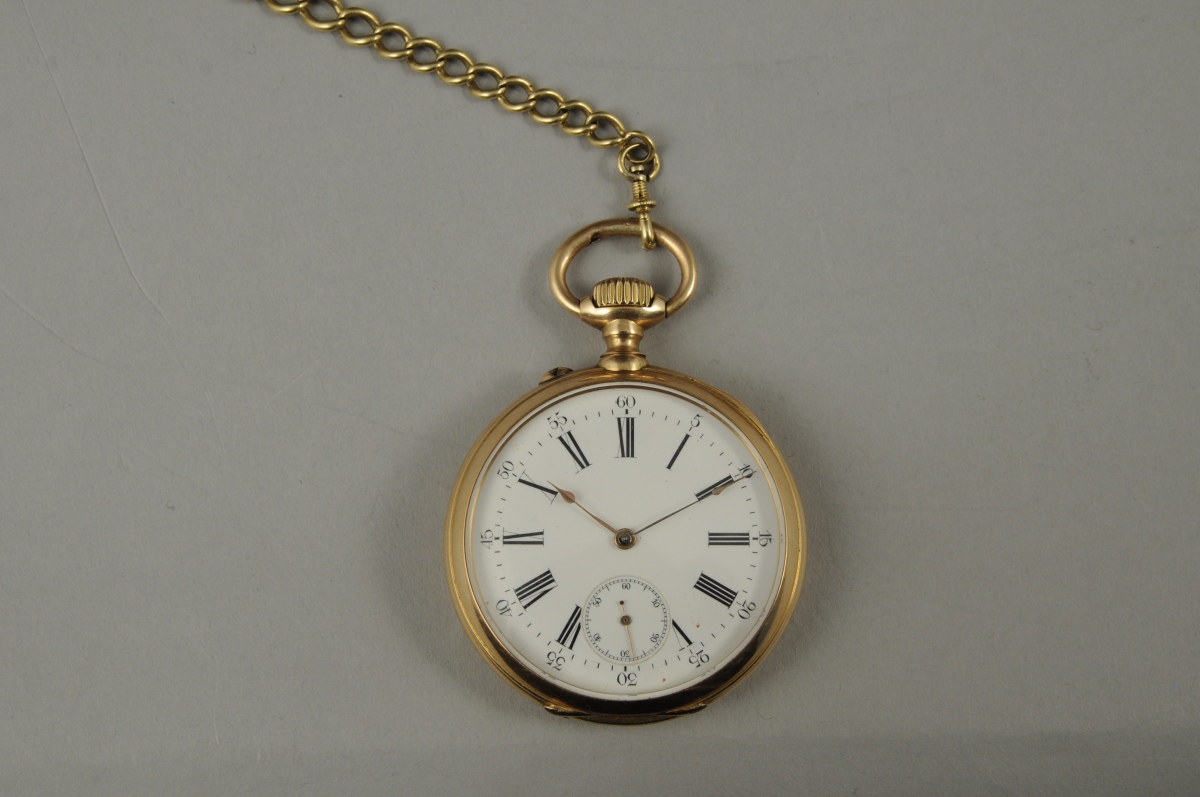 Avec sa CHAÎNE GILETIÈRE en or. Long. 35 cm. Poids : 29 g.