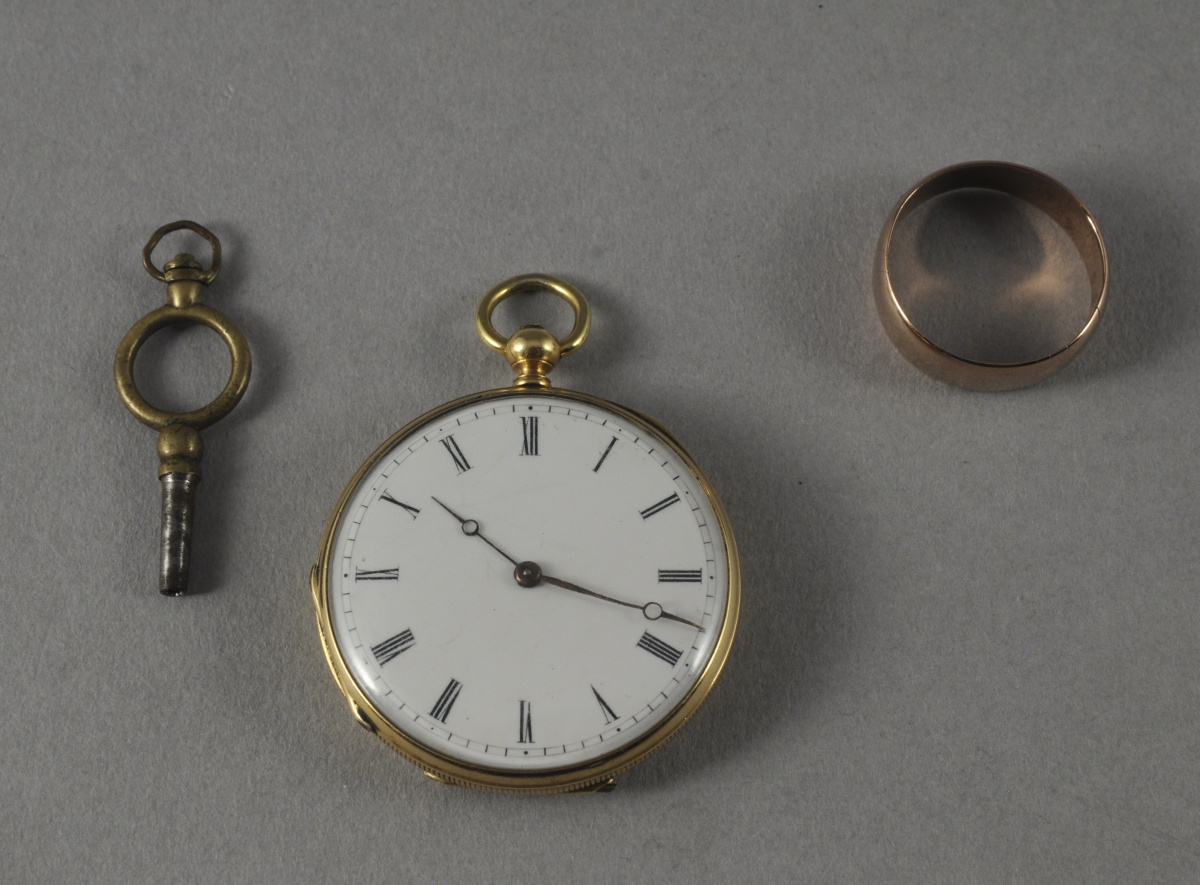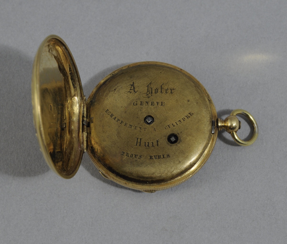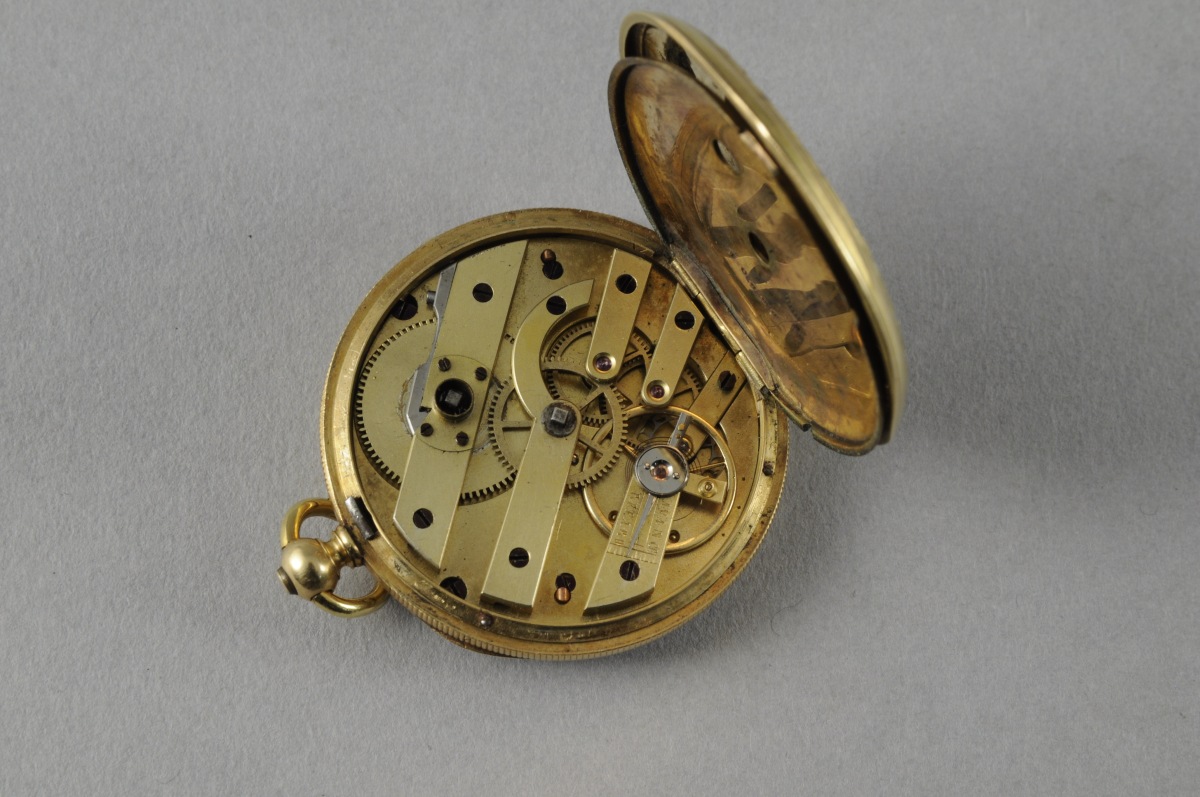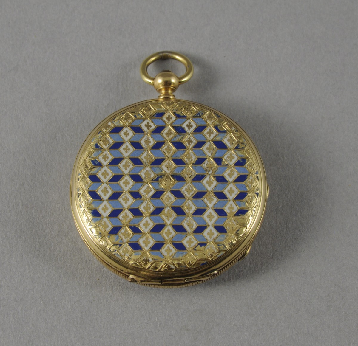 MONTRE DE GOUSSET en or, à clé. Cadran émaillé indiquant les heures en chiffres arabes. Le dos du boîtier ciselé à décor de cubes et trèfles émaillés bleu et blanc. Horloger : A. Hoter à Genève. Diam. 3,5 cm, Poids brut : 32 g.