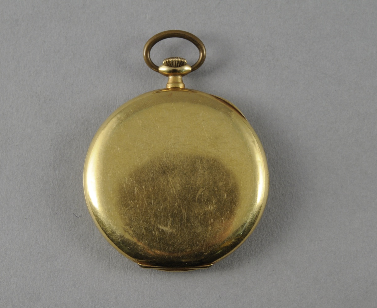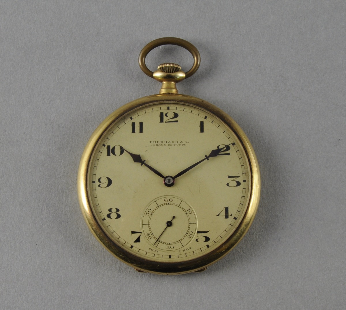 MONTRE DE GOUSSET en or jaune à remontoir au pendant. Cadran double en métal doré indiquant les heures en chiffres arabes et les secondes. Signé "EBERHARD & Co / Chaux-de-Fonds". Le cache-poussière en métal doré signé. Mouvement à échappement à ancre signé et gravé "15 jewels". Début du XXème.