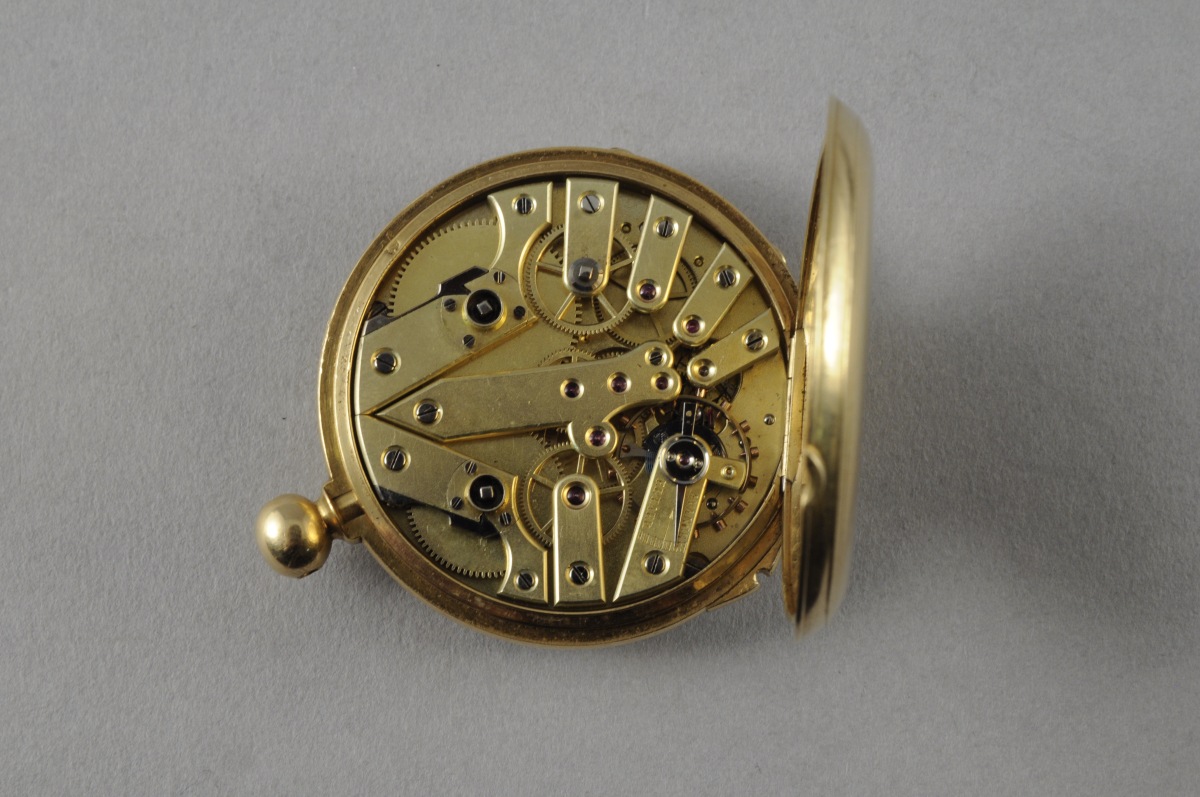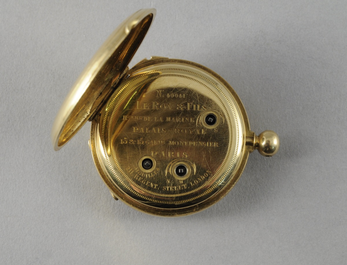 MONTRE DE GOUSSET en or jaune, à clef. Cadran émaillé blanc indiquant les heures en chiffres romains et les minutes en chiffres arabes. Le dos du boîtier monogrammé "MA" sur fond de guillochis. Le cache-poussière gravé "N°49041 / le Roy & Fils / Hgers de la Marine / Palais-Royal / 13 & 15 Galie Montpensier / Paris / 211, Regent Street, London". Échappement à ancre.