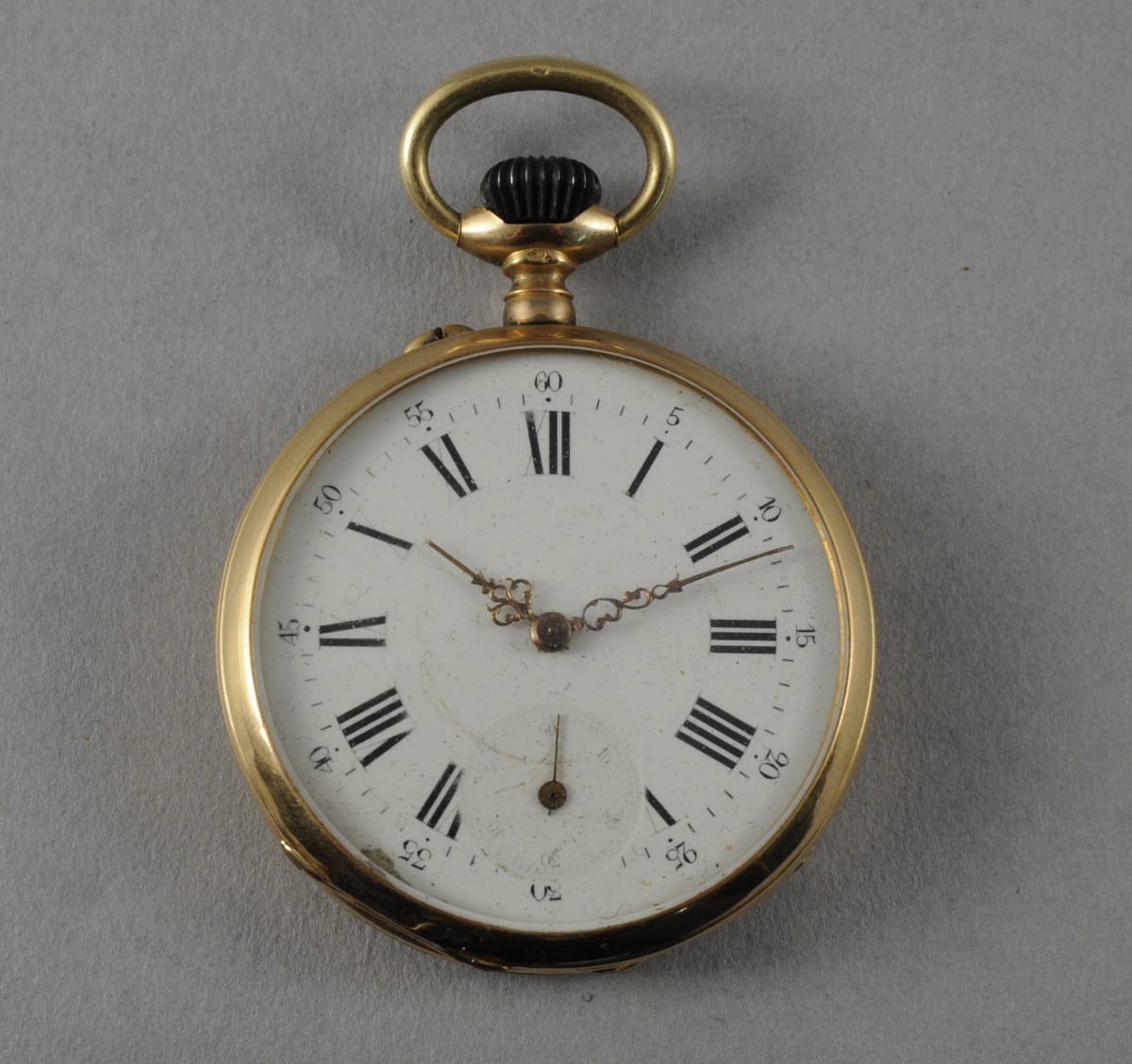 Diam. 4,5 cm. Poids brut : 67,6 g. (manques à l'émail noir et à l'or de la couronne, chocs)